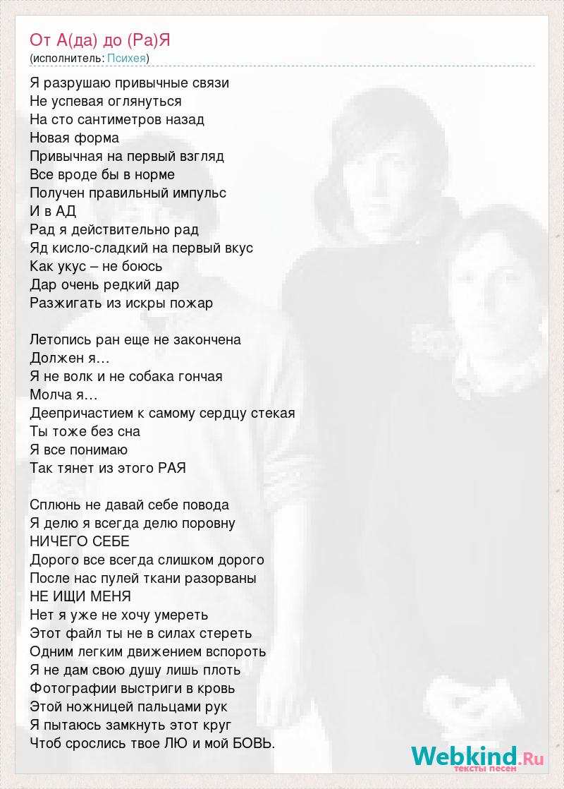 Я разрушаю привычные связи Не успевая оглянуться На сто сантиметров назад Новая форма Привычная на первый взгляд Все вроде бы в норме Получен правильный импульс И в АД Рад я действительно рад Яд кисло-сладкий на первый вкус Как укус – не боюсь Дар очень редкий дар Разжигать из искры пожар Летопись ран еще не закончена Должен я… Я не волк и не собака гончая Молча я… Деепричастием к самому сердцу стекая Ты тоже без сна Я все понимаю Так тянет из этого РАЯ Сплюнь не давай себе повода Я делю я всегда делю поровну НИЧЕГО СЕБЕ Дорого все всегда слишком дорого После нас пулей ткани разорваны НЕ ИЩИ МЕНЯ Нет я уже не хочу умереть Этот файл ты не в силах стереть Одним легким движением вспороть Я не дам свою душу лишь плоть Фотографии выстриги в кровь Этой ножницей пальцами рук Я пытаюсь замкнуть этот круг Чтоб срослись твое ЛЮ и мой БОВЬ.