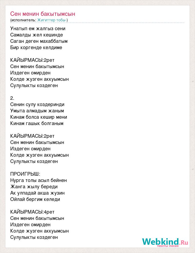 Унатып ем жалгыз сени Самалды жел кешинде Саган деген махаббатым Бир коргенде келдиме КАЙЫРМАСЫ:2рет Сен менин бакытымсын Издеген омирден Колде жузген аккуымсын Сулулыкты коздеген 2. Сенин сулу коздеринди Умыта алмадым жаным Кинам болса кешир мени Кинам гашык болганым КАЙЫРМАСЫ:2рет Сен менин бакытымсын Издеген омирден Колде жузген аккуымсын Сулулыкты коздеген ПРОИГРЫШ: Нурга толы асыл бейнен Жанга жылу береди Ак улпадай акша жузин Ойлай бергим келеди КАЙЫРМАСЫ:4рет Сен менин бакытымсын Издеген омирден Колде жузген аккуымсын Сулулыкты коздеген