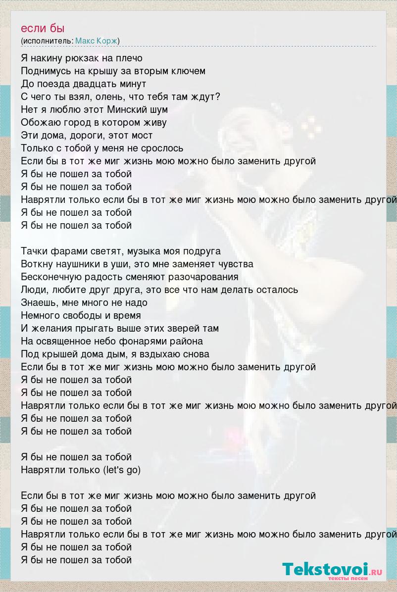 Я накину рюкзак на плечо Поднимусь на крышу за вторым ключем До поезда двадцать минут С чего ты взял, олень, что тебя там ждут? Нет я люблю этот Минский шум Обожаю город в котором живу Эти дома, дороги, этот мост Только с тобой у меня не срослось Если бы в тот же миг жизнь мою можно было заменить другой Я бы не пошел за тобой Я бы не пошел за тобой Наврятли только если бы в тот же миг жизнь мою можно было заменить другой Я бы не пошел за тобой Я бы не пошел за тобой Тачки фарами светят, музыка моя подруга Воткну наушники в уши, это мне заменяет чувства Бесконечную радость сменяют разочарования Люди, любите друг друга, это все что нам делать осталось Знаешь, мне много не надо Немного свободы и время И желания прыгать выше этих зверей там На освященное небо фонарями района Под крышей дома дым, я вздыхаю снова Если бы в тот же миг жизнь мою можно было заменить другой Я бы не пошел за тобой Я бы не пошел за тобой Наврятли только если бы в тот же миг жизнь мою можно было заменить другой Я бы не пошел за тобой Я бы не пошел за тобой Я бы не пошел за тобой Наврятли только (let's go) Если бы в тот же миг жизнь мою можно было заменить другой Я бы не пошел за тобой Я бы не пошел за тобой Наврятли только если бы в тот же миг жизнь мою можно было заменить другой Я бы не пошел за тобой Я бы не пошел за тобой