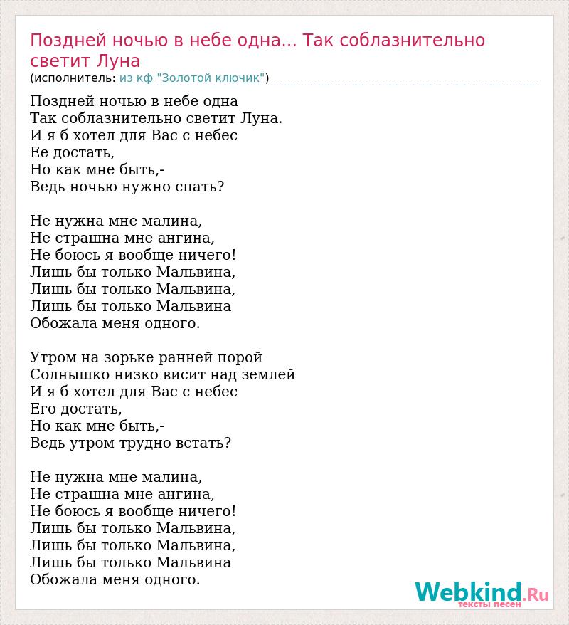 Поздней ночью в небе одна Так соблазнительно светит Луна. И я б хотел для Вас с небес Ее достать, Но как мне быть,- Ведь ночью нужно спать? Не нужна мне малина, Не страшна мне ангина, Не боюсь я вообще ничего! Лишь бы только Мальвина, Лишь бы только Мальвина, Лишь бы только Мальвина Обожала меня одного. Утром на зорьке ранней порой Солнышко низко висит над землей И я б хотел для Вас с небес Его достать, Но как мне быть,- Ведь утром трудно встать? Не нужна мне малина, Не страшна мне ангина, Не боюсь я вообще ничего! Лишь бы только Мальвина, Лишь бы только Мальвина, Лишь бы только Мальвина Обожала меня одного.
