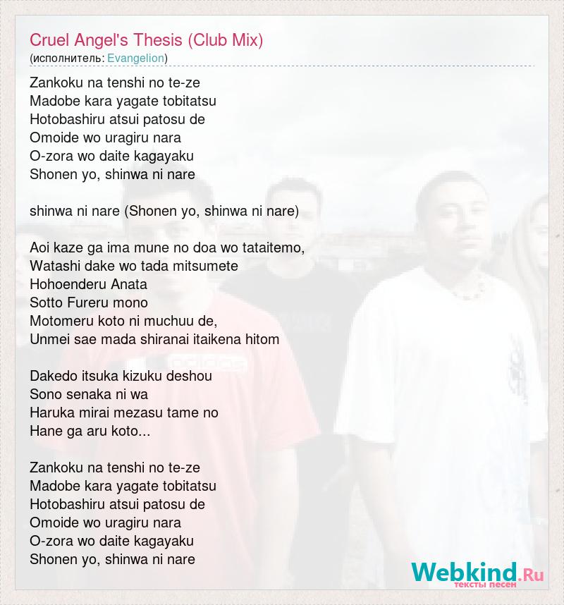 Zankoku na tenshi no te-ze Madobe kara yagate tobitatsu Hotobashiru atsui patosu de Omoide wo uragiru nara O-zora wo daite kagayaku Shonen yo, shinwa ni nare shinwa ni nare (Shonen yo, shinwa ni nare) Aoi kaze ga ima mune no doa wo tataitemo, Watashi dake wo tada mitsumete Hohoenderu Anata Sotto Fureru mono Motomeru koto ni muchuu de, Unmei sae mada shiranai itaikena hitom Dakedo itsuka kizuku deshou Sono senaka ni wa Haruka mirai mezasu tame no Hane ga aru koto... Zankoku na tenshi no te-ze Madobe kara yagate tobitatsu Hotobashiru atsui patosu de Omoide wo uragiru nara O-zora wo daite kagayaku Shonen yo, shinwa ni nare
