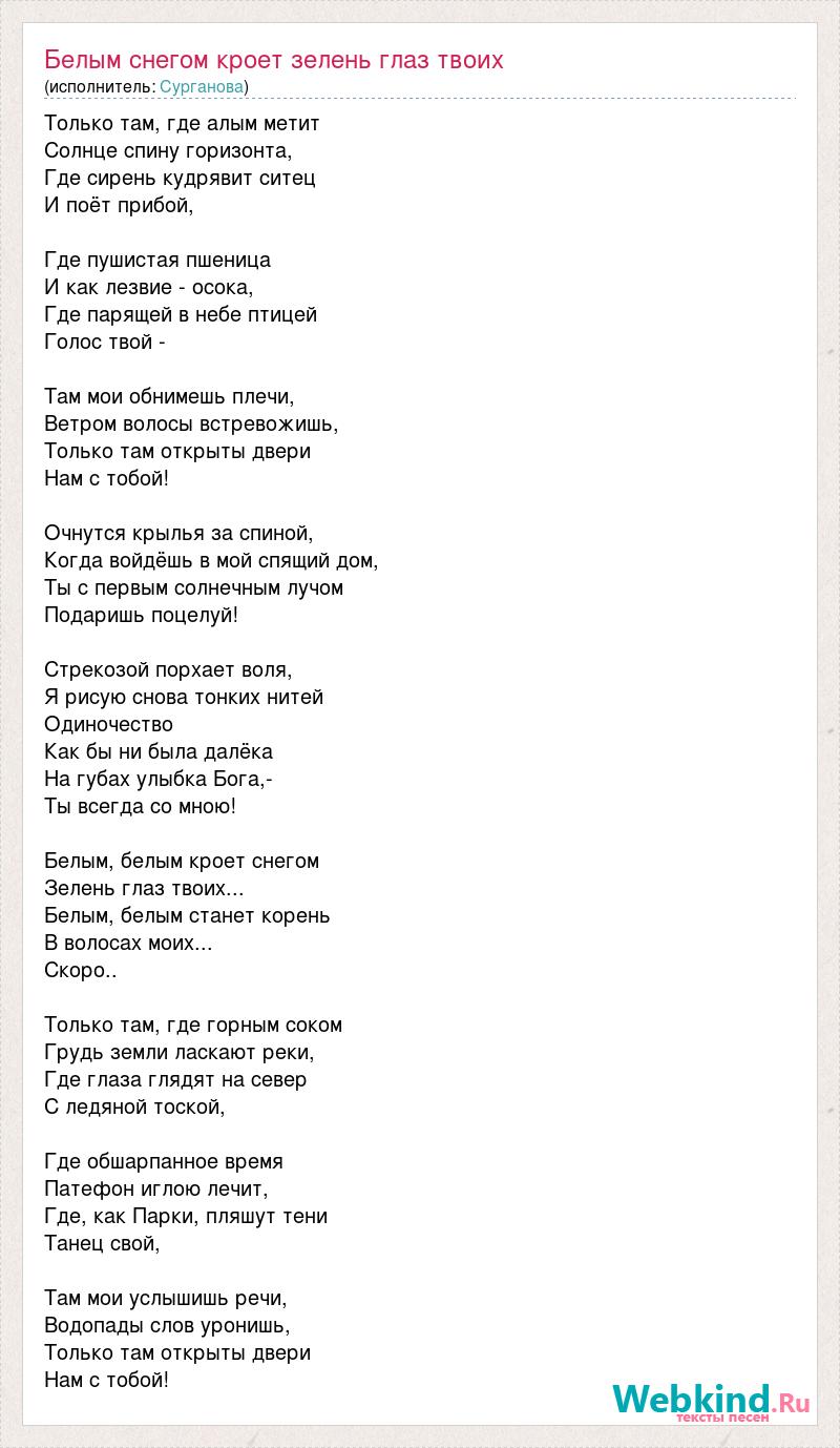 Только там, где алым метит Солнце спину горизонта, Где сирень кудрявит ситец И поёт прибой, Где пушистая пшеница И как лезвие - осока, Где парящей в небе птицей Голос твой - Там мои обнимешь плечи, Ветром волосы встревожишь, Только там открыты двери Нам с тобой! Очнутся крылья за спиной, Когда войдёшь в мой спящий дом, Ты с первым солнечным лучом Подаришь поцелуй! Стрекозой порхает воля, Я рисую снова тонких нитей Одиночество Как бы ни была далёка На губах улыбка Бога,- Ты всегда со мною! Белым, белым кроет снегом Зелень глаз твоих... Белым, белым станет корень В волосах моих... Скоро.. Только там, где горным соком Грудь земли ласкают реки, Где глаза глядят на север С ледяной тоской, Где обшарпанное время Патефон иглою лечит, Где, как Парки, пляшут тени Танец свой, Там мои услышишь речи, Водопады слов уронишь, Только там открыты двери Нам с тобой!