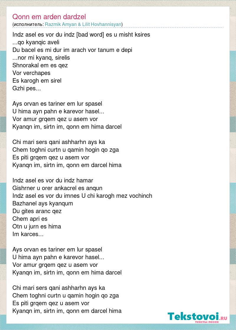 Indz asel es vor du indz sirum es u misht ksires ...qo kyanqic aveli Du bacel es mi dur im arach vor tanum e depi ...nor mi kyanq, sirelis Shnorakal em es qez Vor verchapes Es karogh em sirel Gzhi pes... Ays orvan es tariner em lur spasel U hima ayn pahn e karevor hasel... Vor amur grqem qez u asem vor Kyanqn im, sirtn im, qonn em hima darcel Chi mari sers qani ashharhn ays ka Chem toghni curtn u qamin hogin qo zga Es piti grqem qez u asem vor Kyanqn im, sirtn im, qonn em darcel hima Indz asel es vor du indz hamar Gishrner u orer ankacrel es anqun Indz asel es vor du imnes U chi karogh mez vochinch Bazhanel ays kyanqum Du gites aranc qez Chem apri es Otn u jurn es hima Im karces... Ays orvan es tariner em lur spasel U hima ayn pahn e karevor hasel... Vor amur grqem qez u asem vor Kyanqn im, sirtn im, qonn em hima darcel Chi mari sers qani ashharhn ays ka Chem toghni curtn u qamin hogin qo zga Es piti grqem qez u asem vor Kyanqn im, sirtn im, qonn em darcel hima