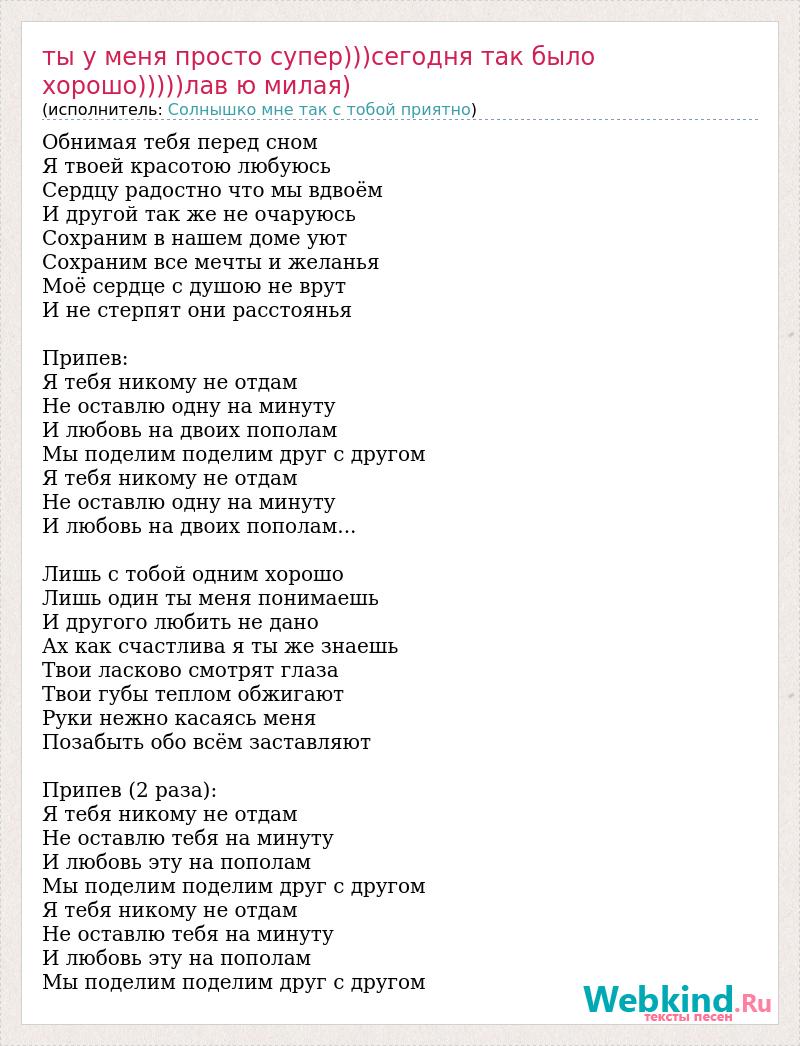 Обнимая тебя перед сном Я твоей красотою любуюсь Сердцу радостно что мы вдвоём И другой так же не очаруюсь Сохраним в нашем доме уют Сохраним все мечты и желанья Моё сердце с душою не врут И не стерпят они расстоянья Припев: Я тебя никому не отдам Не оставлю одну на минуту И любовь на двоих пополам Мы поделим поделим друг с другом Я тебя никому не отдам Не оставлю одну на минуту И любовь на двоих пополам... Лишь с тобой одним хорошо Лишь один ты меня понимаешь И другого любить не дано Ах как счастлива я ты же знаешь Твои ласково смотрят глаза Твои губы теплом обжигают Руки нежно касаясь меня Позабыть обо всём заставляют Припев (2 раза): Я тебя никому не отдам Не оставлю тебя на минуту И любовь эту на пополам Мы поделим поделим друг с другом Я тебя никому не отдам Не оставлю тебя на минуту И любовь эту на пополам Мы поделим поделим друг с другом