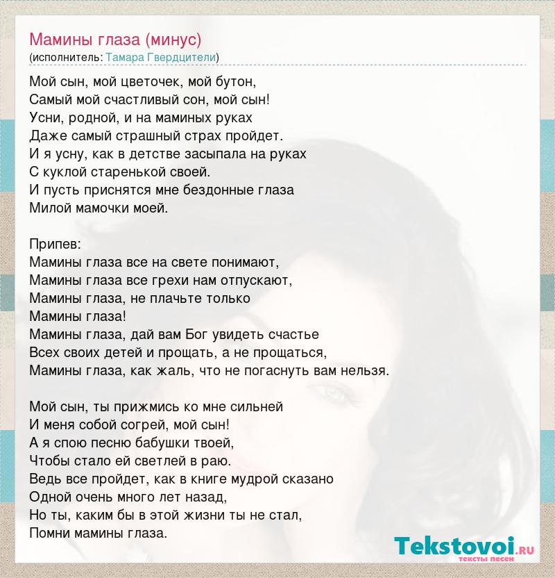 Мой сын, мой цветочек, мой бутон, Самый мой счастливый сон, мой сын! Усни, родной, и на маминых руках Даже самый страшный страх пройдет. И я усну, как в детстве засыпала на руках С куклой старенькой своей. И пусть приснятся мне бездонные глаза Милой мамочки моей. Припев: Мамины глаза все на свете понимают, Мамины глаза все грехи нам отпускают, Мамины глаза, не плачьте только Мамины глаза! Мамины глаза, дай вам Бог увидеть счастье Всех своих детей и прощать, а не прощаться, Мамины глаза, как жаль, что не погаснуть вам нельзя. Мой сын, ты прижмись ко мне сильней И меня собой согрей, мой сын! А я спою песню бабушки твоей, Чтобы стало ей светлей в раю. Ведь все пройдет, как в книге мудрой сказано Одной очень много лет назад, Но ты, каким бы в этой жизни ты не стал, Помни мамины глаза.