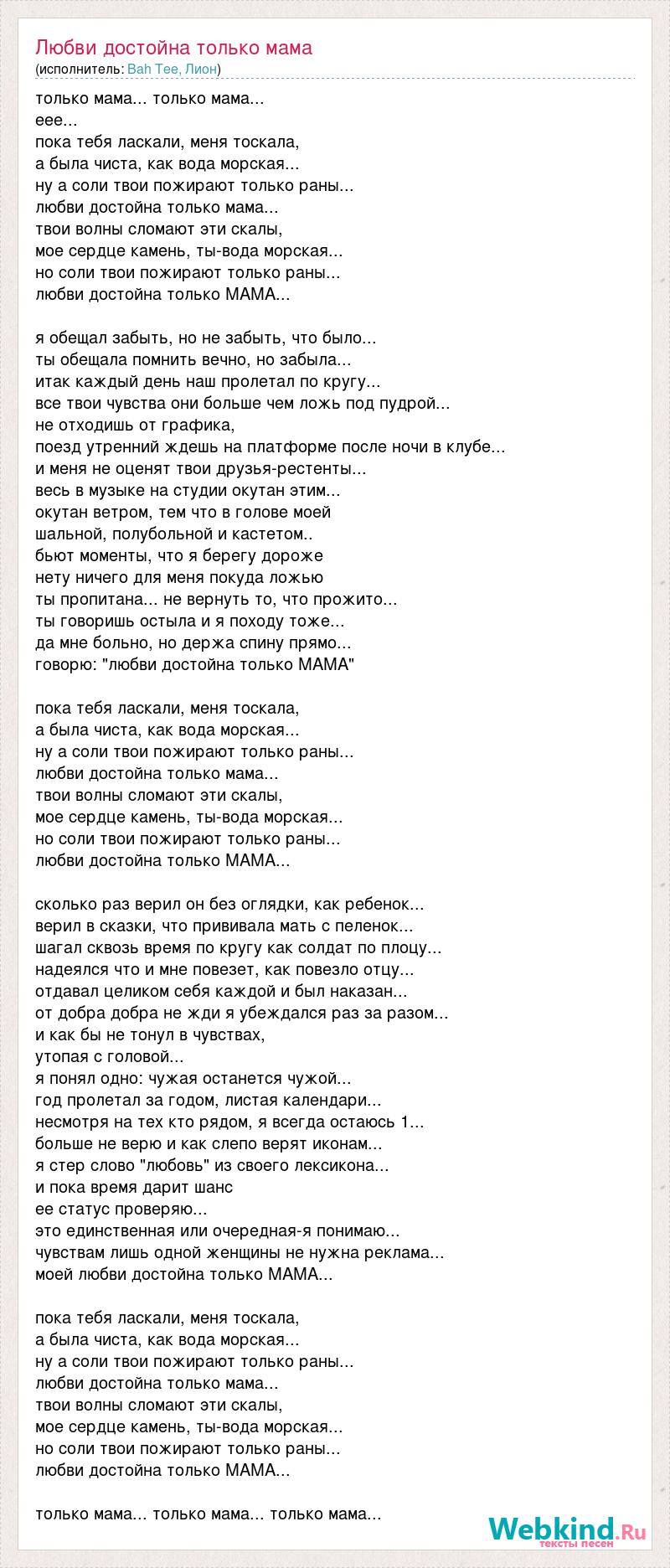 только мама... только мама... еее... пока тебя ласкали, меня тоскала, а была чиста, как вода морская... ну а соли твои пожирают только раны... любви достойна только мама... твои волны сломают эти скалы, мое сердце камень, ты-вода морская... но соли твои пожирают только раны... любви достойна только МАМА... я обещал забыть, но не забыть, что было... ты обещала помнить вечно, но забыла... итак каждый день наш пролетал по кругу... все твои чувства они больше чем ложь под пудрой... не отходишь от графика, поезд утренний ждешь на платформе после ночи в клубе... и меня не оценят твои друзья-рестенты... весь в музыке на студии окутан этим... окутан ветром, тем что в голове моей шальной, полубольной и кастетом.. бьют моменты, что я берегу дороже нету ничего для меня покуда ложью ты пропитана... не вернуть то, что прожито... ты говоришь остыла и я походу тоже... да мне больно, но держа спину прямо... говорю: "любви достойна только МАМА" пока тебя ласкали, меня тоскала, а была чиста, как вода морская... ну а соли твои пожирают только раны... любви достойна только мама... твои волны сломают эти скалы, мое сердце камень, ты-вода морская... но соли твои пожирают только раны... любви достойна только МАМА... сколько раз верил он без оглядки, как ребенок... верил в сказки, что прививала мать с пеленок... шагал сквозь время по кругу как солдат по плоцу... надеялся что и мне повезет, как повезло отцу... отдавал целиком себя каждой и был наказан... от добра добра не жди я убеждался раз за разом... и как бы не тонул в чувствах, утопая с головой... я понял одно: чужая останется чужой... год пролетал за годом, листая календари... несмотря на тех кто рядом, я всегда остаюсь 1... больше не верю и как слепо верят иконам... я стер слово "любовь" из своего лексикона... и пока время дарит шанс ее статус проверяю... это единственная или очередная-я понимаю... чувствам лишь одной женщины не нужна реклама... моей любви достойна только МАМА... пока тебя ласкали, меня тоскала, а была чиста, как вода морская... ну а соли твои пожирают только раны... любви достойна только мама... твои волны сломают эти скалы, мое сердце камень, ты-вода морская... но соли твои пожирают только раны... любви достойна только МАМА... только мама... только мама... только мама...