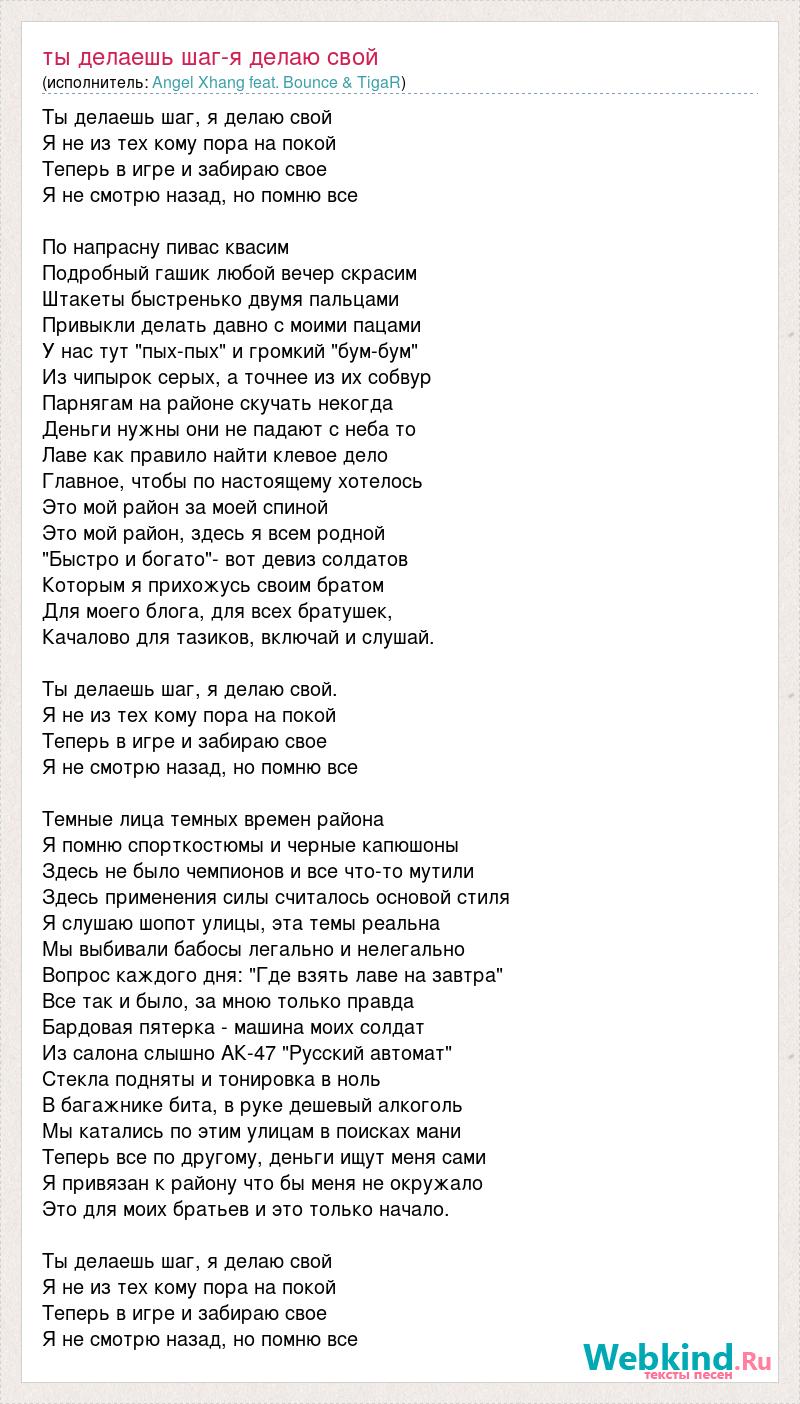 Ты делаешь шаг, я делаю свой Я не из тех кому пора на покой Теперь в игре и забираю свое Я не смотрю назад, но помню все По напрасну пивас квасим Подробный гашик любой вечер скрасим Штакеты быстренько двумя пальцами Привыкли делать давно с моими пацами У нас тут "пых-пых" и громкий "бум-бум" Из чипырок серых, а точнее из их собвур Парнягам на районе скучать некогда Деньги нужны они не падают с неба то Лаве как правило найти клевое дело Главное, чтобы по настоящему хотелось Это мой район за моей спиной Это мой район, здесь я всем родной "Быстро и богато"- вот девиз солдатов Которым я прихожусь своим братом Для моего блога, для всех братушек, Качалово для тазиков, включай и слушай. Ты делаешь шаг, я делаю свой. Я не из тех кому пора на покой Теперь в игре и забираю свое Я не смотрю назад, но помню все Темные лица темных времен района Я помню спорткостюмы и черные капюшоны Здесь не было чемпионов и все что-то мутили Здесь применения силы считалось основой стиля Я слушаю шопот улицы, эта темы реальна Мы выбивали бабосы легально и нелегально Вопрос каждого дня: "Где взять лаве на завтра" Все так и было, за мною только правда Бардовая пятерка - машина моих солдат Из салона слышно АК-47 "Русский автомат" Стекла подняты и тонировка в ноль В багажнике бита, в руке дешевый алкоголь Мы катались по этим улицам в поисках мани Теперь все по другому, деньги ищут меня сами Я привязан к району что бы меня не окружало Это для моих братьев и это только начало. Ты делаешь шаг, я делаю свой Я не из тех кому пора на покой Теперь в игре и забираю свое Я не смотрю назад, но помню все