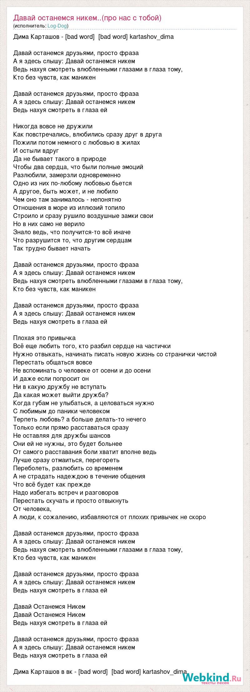 Дима Карташов - [bad word] [bad word] kartashov_dima Давай останемся друзьями, просто фраза А я здесь слышу: Давай останемся никем Ведь нахуя смотреть влюбленными глазами в глаза тому, Кто без чувств, как маникен Давай останемся друзьями, просто фраза А я здесь слышу: Давай останемся никем Ведь нахуя смотреть в глаза ей Никогда вовсе не дружили Как повстречались, влюбились сразу друг в друга Пожили потом немного с любовью в жилах И остыли вдруг Да не бывает такого в природе Чтобы два сердца, что были полные эмоций Разлюбили, замерзли одновременно Одно из них по-любому любовью бьется А другое, быть может, и не любило Чем оно там занималось - непонятно Отношения в море из иллюзий топило Строило и сразу рушило воздушные замки свои Но в них само не верило Знало ведь, что получится-то всё иначе Что разрушится то, что другим сердцам Так трудно бывает начать Давай останемся друзьями, просто фраза А я здесь слышу: Давай останемся никем Ведь нахуя смотреть влюбленными глазами в глаза тому, Кто без чувств, как маникен Давай останемся друзьями, просто фраза А я здесь слышу: Давай останемся никем Ведь нахуя смотреть в глаза ей Плохая это привычка Всё еще любить того, кто разбил сердце на частички Нужно отвыкать, начинать писать новую жизнь со странички чистой Перестать общаться вовсе Не вспоминать о человеке от осени и до осени И даже если попросит он Ни в какую дружбу не вступать Да какая может выйти дружба? Когда губам не улыбаться, а целоваться нужно С любимым до паники человеком Терпеть любовь? а больше делать-то нечего Только если прямо расставаться сразу Не оставляя для дружбы шансов Они ей не нужны, это будет больнее От самого расставания боли хватит вполне ведь Лучше сразу отмаиться, перегореть Переболеть, разлюбить со временем А не страдать надеждою в течение общения Что всё будет как прежде Надо избегать встреч и разговоров Перестать скучать и просто отвыкнуть От человека, А люди, к сожалению, избавляются от плохих привычек не скоро Давай останемся друзьями, просто фраза А я здесь слышу: Давай останемся никем Ведь нахуя смотреть влюбленными глазами в глаза тому, Кто без чувств, как маникен Давай останемся друзьями, просто фраза А я здесь слышу: Давай останемся никем Ведь нахуя смотреть в глаза ей Давай Останемся Никем Давай Останемся Никем Ведь нахуя смотреть в глаза ей Давай останемся друзьями, просто фраза А я здесь слышу: Давай останемся никем Ведь нахуя смотреть в глаза ей Дима Карташов в вк - [bad word] [bad word] kartashov_dima