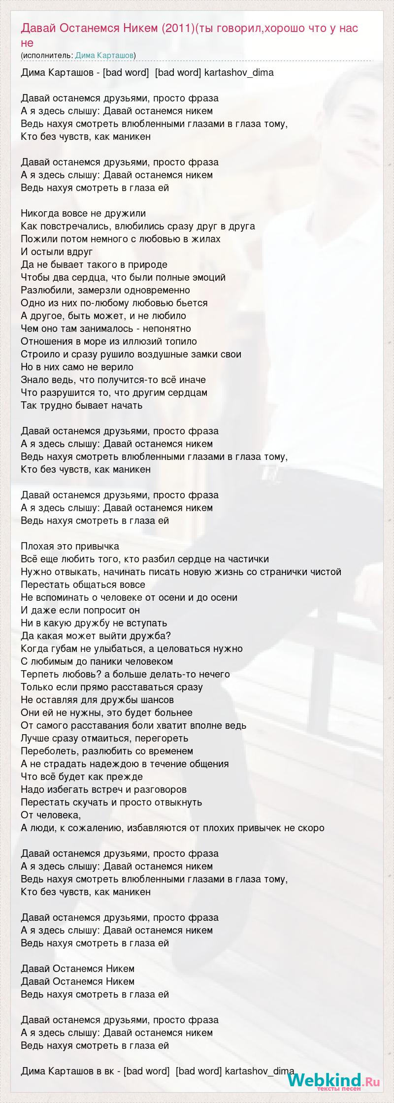 Дима Карташов - [bad word] [bad word] kartashov_dima Давай останемся друзьями, просто фраза А я здесь слышу: Давай останемся никем Ведь нахуя смотреть влюбленными глазами в глаза тому, Кто без чувств, как маникен Давай останемся друзьями, просто фраза А я здесь слышу: Давай останемся никем Ведь нахуя смотреть в глаза ей Никогда вовсе не дружили Как повстречались, влюбились сразу друг в друга Пожили потом немного с любовью в жилах И остыли вдруг Да не бывает такого в природе Чтобы два сердца, что были полные эмоций Разлюбили, замерзли одновременно Одно из них по-любому любовью бьется А другое, быть может, и не любило Чем оно там занималось - непонятно Отношения в море из иллюзий топило Строило и сразу рушило воздушные замки свои Но в них само не верило Знало ведь, что получится-то всё иначе Что разрушится то, что другим сердцам Так трудно бывает начать Давай останемся друзьями, просто фраза А я здесь слышу: Давай останемся никем Ведь нахуя смотреть влюбленными глазами в глаза тому, Кто без чувств, как маникен Давай останемся друзьями, просто фраза А я здесь слышу: Давай останемся никем Ведь нахуя смотреть в глаза ей Плохая это привычка Всё еще любить того, кто разбил сердце на частички Нужно отвыкать, начинать писать новую жизнь со странички чистой Перестать общаться вовсе Не вспоминать о человеке от осени и до осени И даже если попросит он Ни в какую дружбу не вступать Да какая может выйти дружба? Когда губам не улыбаться, а целоваться нужно С любимым до паники человеком Терпеть любовь? а больше делать-то нечего Только если прямо расставаться сразу Не оставляя для дружбы шансов Они ей не нужны, это будет больнее От самого расставания боли хватит вполне ведь Лучше сразу отмаиться, перегореть Переболеть, разлюбить со временем А не страдать надеждою в течение общения Что всё будет как прежде Надо избегать встреч и разговоров Перестать скучать и просто отвыкнуть От человека, А люди, к сожалению, избавляются от плохих привычек не скоро Давай останемся друзьями, просто фраза А я здесь слышу: Давай останемся никем Ведь нахуя смотреть влюбленными глазами в глаза тому, Кто без чувств, как маникен Давай останемся друзьями, просто фраза А я здесь слышу: Давай останемся никем Ведь нахуя смотреть в глаза ей Давай Останемся Никем Давай Останемся Никем Ведь нахуя смотреть в глаза ей Давай останемся друзьями, просто фраза А я здесь слышу: Давай останемся никем Ведь нахуя смотреть в глаза ей Дима Карташов в вк - [bad word] [bad word] kartashov_dima