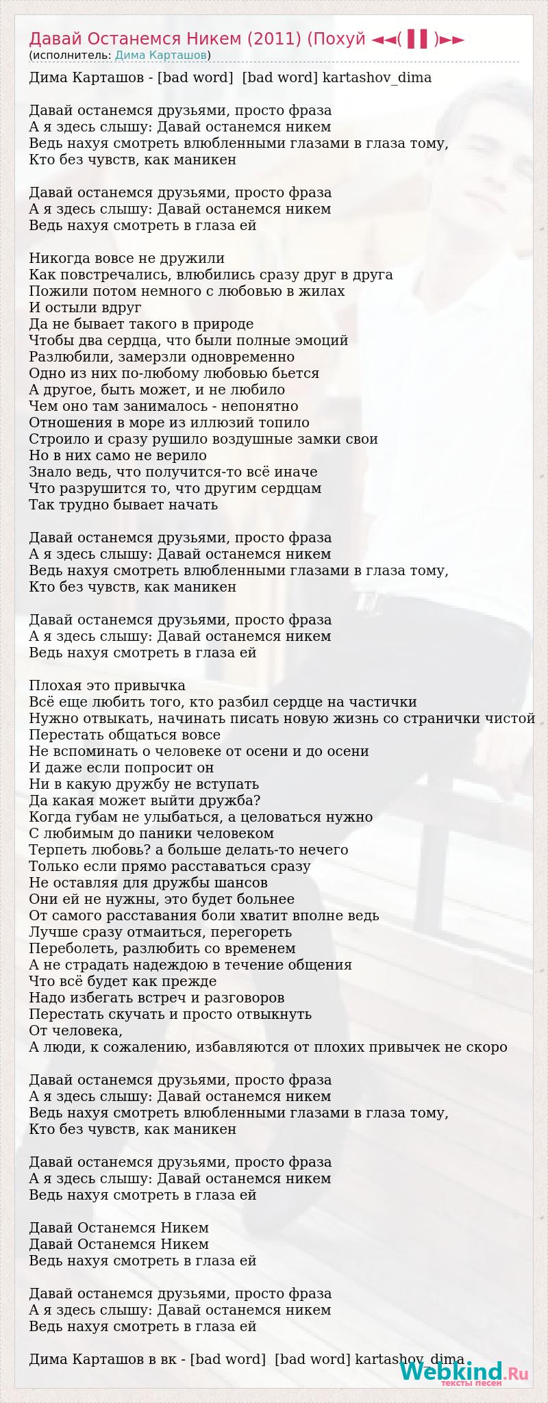 Дима Карташов - [bad word] [bad word] kartashov_dima Давай останемся друзьями, просто фраза А я здесь слышу: Давай останемся никем Ведь нахуя смотреть влюбленными глазами в глаза тому, Кто без чувств, как маникен Давай останемся друзьями, просто фраза А я здесь слышу: Давай останемся никем Ведь нахуя смотреть в глаза ей Никогда вовсе не дружили Как повстречались, влюбились сразу друг в друга Пожили потом немного с любовью в жилах И остыли вдруг Да не бывает такого в природе Чтобы два сердца, что были полные эмоций Разлюбили, замерзли одновременно Одно из них по-любому любовью бьется А другое, быть может, и не любило Чем оно там занималось - непонятно Отношения в море из иллюзий топило Строило и сразу рушило воздушные замки свои Но в них само не верило Знало ведь, что получится-то всё иначе Что разрушится то, что другим сердцам Так трудно бывает начать Давай останемся друзьями, просто фраза А я здесь слышу: Давай останемся никем Ведь нахуя смотреть влюбленными глазами в глаза тому, Кто без чувств, как маникен Давай останемся друзьями, просто фраза А я здесь слышу: Давай останемся никем Ведь нахуя смотреть в глаза ей Плохая это привычка Всё еще любить того, кто разбил сердце на частички Нужно отвыкать, начинать писать новую жизнь со странички чистой Перестать общаться вовсе Не вспоминать о человеке от осени и до осени И даже если попросит он Ни в какую дружбу не вступать Да какая может выйти дружба? Когда губам не улыбаться, а целоваться нужно С любимым до паники человеком Терпеть любовь? а больше делать-то нечего Только если прямо расставаться сразу Не оставляя для дружбы шансов Они ей не нужны, это будет больнее От самого расставания боли хватит вполне ведь Лучше сразу отмаиться, перегореть Переболеть, разлюбить со временем А не страдать надеждою в течение общения Что всё будет как прежде Надо избегать встреч и разговоров Перестать скучать и просто отвыкнуть От человека, А люди, к сожалению, избавляются от плохих привычек не скоро Давай останемся друзьями, просто фраза А я здесь слышу: Давай останемся никем Ведь нахуя смотреть влюбленными глазами в глаза тому, Кто без чувств, как маникен Давай останемся друзьями, просто фраза А я здесь слышу: Давай останемся никем Ведь нахуя смотреть в глаза ей Давай Останемся Никем Давай Останемся Никем Ведь нахуя смотреть в глаза ей Давай останемся друзьями, просто фраза А я здесь слышу: Давай останемся никем Ведь нахуя смотреть в глаза ей Дима Карташов в вк - [bad word] [bad word] kartashov_dima