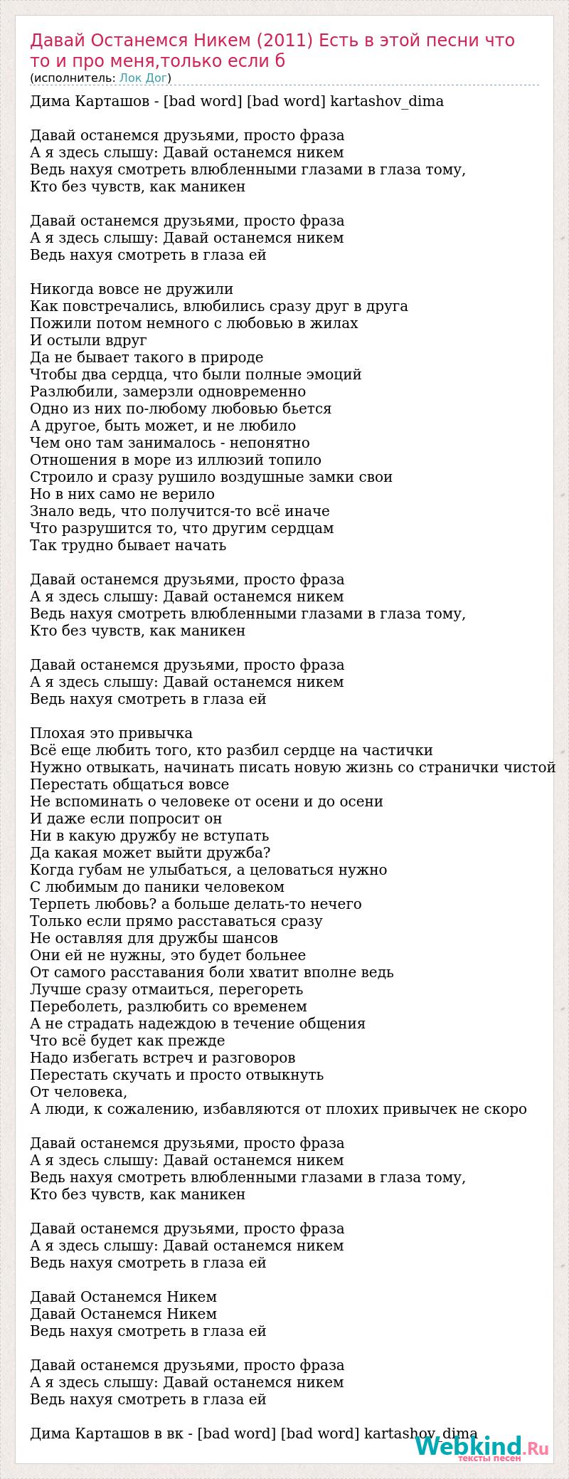 Дима Карташов - [bad word] [bad word] kartashov_dima Давай останемся друзьями, просто фраза А я здесь слышу: Давай останемся никем Ведь нахуя смотреть влюбленными глазами в глаза тому, Кто без чувств, как маникен Давай останемся друзьями, просто фраза А я здесь слышу: Давай останемся никем Ведь нахуя смотреть в глаза ей Никогда вовсе не дружили Как повстречались, влюбились сразу друг в друга Пожили потом немного с любовью в жилах И остыли вдруг Да не бывает такого в природе Чтобы два сердца, что были полные эмоций Разлюбили, замерзли одновременно Одно из них по-любому любовью бьется А другое, быть может, и не любило Чем оно там занималось - непонятно Отношения в море из иллюзий топило Строило и сразу рушило воздушные замки свои Но в них само не верило Знало ведь, что получится-то всё иначе Что разрушится то, что другим сердцам Так трудно бывает начать Давай останемся друзьями, просто фраза А я здесь слышу: Давай останемся никем Ведь нахуя смотреть влюбленными глазами в глаза тому, Кто без чувств, как маникен Давай останемся друзьями, просто фраза А я здесь слышу: Давай останемся никем Ведь нахуя смотреть в глаза ей Плохая это привычка Всё еще любить того, кто разбил сердце на частички Нужно отвыкать, начинать писать новую жизнь со странички чистой Перестать общаться вовсе Не вспоминать о человеке от осени и до осени И даже если попросит он Ни в какую дружбу не вступать Да какая может выйти дружба? Когда губам не улыбаться, а целоваться нужно С любимым до паники человеком Терпеть любовь? а больше делать-то нечего Только если прямо расставаться сразу Не оставляя для дружбы шансов Они ей не нужны, это будет больнее От самого расставания боли хватит вполне ведь Лучше сразу отмаиться, перегореть Переболеть, разлюбить со временем А не страдать надеждою в течение общения Что всё будет как прежде Надо избегать встреч и разговоров Перестать скучать и просто отвыкнуть От человека, А люди, к сожалению, избавляются от плохих привычек не скоро Давай останемся друзьями, просто фраза А я здесь слышу: Давай останемся никем Ведь нахуя смотреть влюбленными глазами в глаза тому, Кто без чувств, как маникен Давай останемся друзьями, просто фраза А я здесь слышу: Давай останемся никем Ведь нахуя смотреть в глаза ей Давай Останемся Никем Давай Останемся Никем Ведь нахуя смотреть в глаза ей Давай останемся друзьями, просто фраза А я здесь слышу: Давай останемся никем Ведь нахуя смотреть в глаза ей Дима Карташов в вк - [bad word] [bad word] kartashov_dima