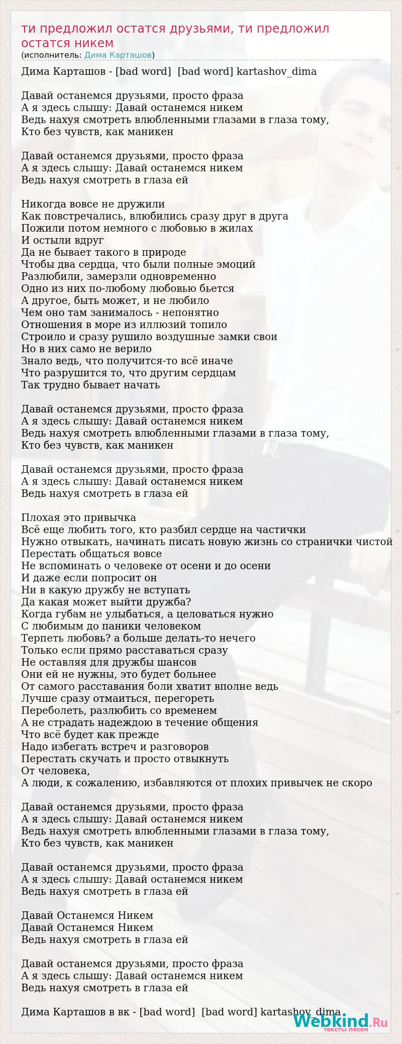 Дима Карташов - [bad word] [bad word] kartashov_dima Давай останемся друзьями, просто фраза А я здесь слышу: Давай останемся никем Ведь нахуя смотреть влюбленными глазами в глаза тому, Кто без чувств, как маникен Давай останемся друзьями, просто фраза А я здесь слышу: Давай останемся никем Ведь нахуя смотреть в глаза ей Никогда вовсе не дружили Как повстречались, влюбились сразу друг в друга Пожили потом немного с любовью в жилах И остыли вдруг Да не бывает такого в природе Чтобы два сердца, что были полные эмоций Разлюбили, замерзли одновременно Одно из них по-любому любовью бьется А другое, быть может, и не любило Чем оно там занималось - непонятно Отношения в море из иллюзий топило Строило и сразу рушило воздушные замки свои Но в них само не верило Знало ведь, что получится-то всё иначе Что разрушится то, что другим сердцам Так трудно бывает начать Давай останемся друзьями, просто фраза А я здесь слышу: Давай останемся никем Ведь нахуя смотреть влюбленными глазами в глаза тому, Кто без чувств, как маникен Давай останемся друзьями, просто фраза А я здесь слышу: Давай останемся никем Ведь нахуя смотреть в глаза ей Плохая это привычка Всё еще любить того, кто разбил сердце на частички Нужно отвыкать, начинать писать новую жизнь со странички чистой Перестать общаться вовсе Не вспоминать о человеке от осени и до осени И даже если попросит он Ни в какую дружбу не вступать Да какая может выйти дружба? Когда губам не улыбаться, а целоваться нужно С любимым до паники человеком Терпеть любовь? а больше делать-то нечего Только если прямо расставаться сразу Не оставляя для дружбы шансов Они ей не нужны, это будет больнее От самого расставания боли хватит вполне ведь Лучше сразу отмаиться, перегореть Переболеть, разлюбить со временем А не страдать надеждою в течение общения Что всё будет как прежде Надо избегать встреч и разговоров Перестать скучать и просто отвыкнуть От человека, А люди, к сожалению, избавляются от плохих привычек не скоро Давай останемся друзьями, просто фраза А я здесь слышу: Давай останемся никем Ведь нахуя смотреть влюбленными глазами в глаза тому, Кто без чувств, как маникен Давай останемся друзьями, просто фраза А я здесь слышу: Давай останемся никем Ведь нахуя смотреть в глаза ей Давай Останемся Никем Давай Останемся Никем Ведь нахуя смотреть в глаза ей Давай останемся друзьями, просто фраза А я здесь слышу: Давай останемся никем Ведь нахуя смотреть в глаза ей Дима Карташов в вк - [bad word] [bad word] kartashov_dima