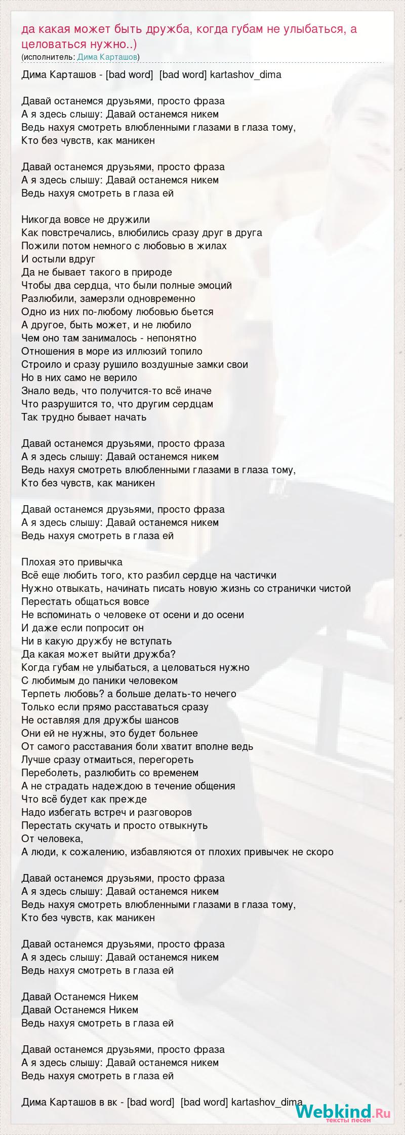 Дима Карташов - [bad word] [bad word] kartashov_dima Давай останемся друзьями, просто фраза А я здесь слышу: Давай останемся никем Ведь нахуя смотреть влюбленными глазами в глаза тому, Кто без чувств, как маникен Давай останемся друзьями, просто фраза А я здесь слышу: Давай останемся никем Ведь нахуя смотреть в глаза ей Никогда вовсе не дружили Как повстречались, влюбились сразу друг в друга Пожили потом немного с любовью в жилах И остыли вдруг Да не бывает такого в природе Чтобы два сердца, что были полные эмоций Разлюбили, замерзли одновременно Одно из них по-любому любовью бьется А другое, быть может, и не любило Чем оно там занималось - непонятно Отношения в море из иллюзий топило Строило и сразу рушило воздушные замки свои Но в них само не верило Знало ведь, что получится-то всё иначе Что разрушится то, что другим сердцам Так трудно бывает начать Давай останемся друзьями, просто фраза А я здесь слышу: Давай останемся никем Ведь нахуя смотреть влюбленными глазами в глаза тому, Кто без чувств, как маникен Давай останемся друзьями, просто фраза А я здесь слышу: Давай останемся никем Ведь нахуя смотреть в глаза ей Плохая это привычка Всё еще любить того, кто разбил сердце на частички Нужно отвыкать, начинать писать новую жизнь со странички чистой Перестать общаться вовсе Не вспоминать о человеке от осени и до осени И даже если попросит он Ни в какую дружбу не вступать Да какая может выйти дружба? Когда губам не улыбаться, а целоваться нужно С любимым до паники человеком Терпеть любовь? а больше делать-то нечего Только если прямо расставаться сразу Не оставляя для дружбы шансов Они ей не нужны, это будет больнее От самого расставания боли хватит вполне ведь Лучше сразу отмаиться, перегореть Переболеть, разлюбить со временем А не страдать надеждою в течение общения Что всё будет как прежде Надо избегать встреч и разговоров Перестать скучать и просто отвыкнуть От человека, А люди, к сожалению, избавляются от плохих привычек не скоро Давай останемся друзьями, просто фраза А я здесь слышу: Давай останемся никем Ведь нахуя смотреть влюбленными глазами в глаза тому, Кто без чувств, как маникен Давай останемся друзьями, просто фраза А я здесь слышу: Давай останемся никем Ведь нахуя смотреть в глаза ей Давай Останемся Никем Давай Останемся Никем Ведь нахуя смотреть в глаза ей Давай останемся друзьями, просто фраза А я здесь слышу: Давай останемся никем Ведь нахуя смотреть в глаза ей Дима Карташов в вк - [bad word] [bad word] kartashov_dima