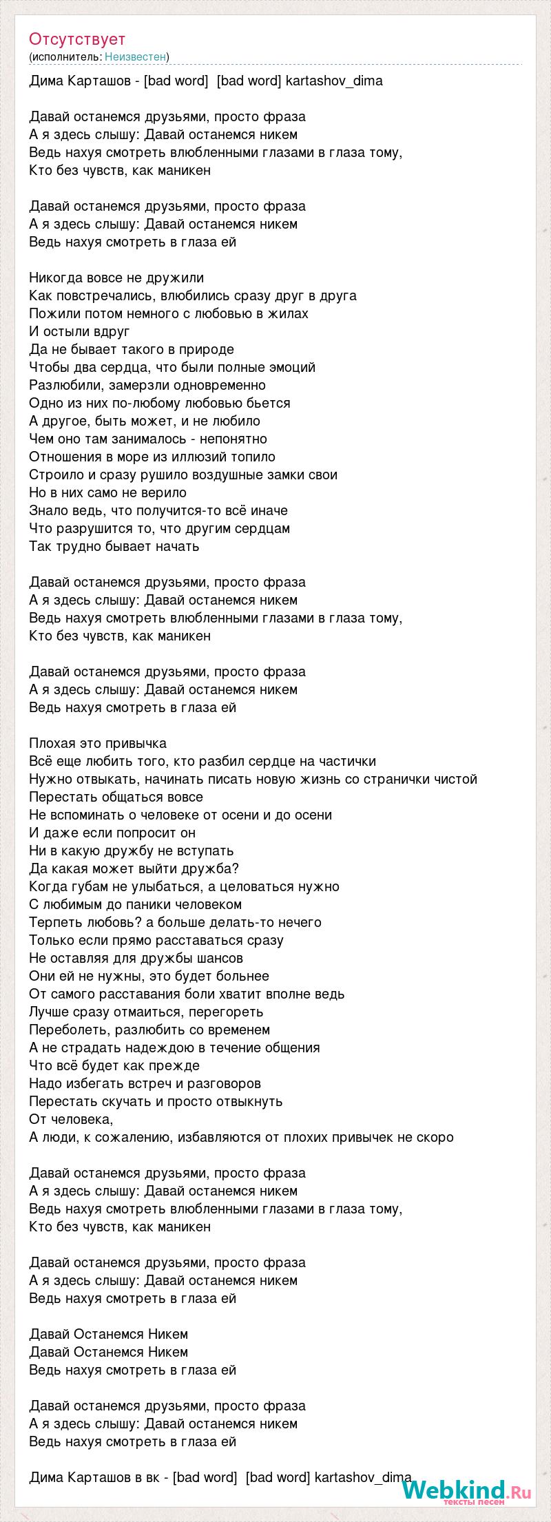 Дима Карташов - [bad word] [bad word] kartashov_dima Давай останемся друзьями, просто фраза А я здесь слышу: Давай останемся никем Ведь нахуя смотреть влюбленными глазами в глаза тому, Кто без чувств, как маникен Давай останемся друзьями, просто фраза А я здесь слышу: Давай останемся никем Ведь нахуя смотреть в глаза ей Никогда вовсе не дружили Как повстречались, влюбились сразу друг в друга Пожили потом немного с любовью в жилах И остыли вдруг Да не бывает такого в природе Чтобы два сердца, что были полные эмоций Разлюбили, замерзли одновременно Одно из них по-любому любовью бьется А другое, быть может, и не любило Чем оно там занималось - непонятно Отношения в море из иллюзий топило Строило и сразу рушило воздушные замки свои Но в них само не верило Знало ведь, что получится-то всё иначе Что разрушится то, что другим сердцам Так трудно бывает начать Давай останемся друзьями, просто фраза А я здесь слышу: Давай останемся никем Ведь нахуя смотреть влюбленными глазами в глаза тому, Кто без чувств, как маникен Давай останемся друзьями, просто фраза А я здесь слышу: Давай останемся никем Ведь нахуя смотреть в глаза ей Плохая это привычка Всё еще любить того, кто разбил сердце на частички Нужно отвыкать, начинать писать новую жизнь со странички чистой Перестать общаться вовсе Не вспоминать о человеке от осени и до осени И даже если попросит он Ни в какую дружбу не вступать Да какая может выйти дружба? Когда губам не улыбаться, а целоваться нужно С любимым до паники человеком Терпеть любовь? а больше делать-то нечего Только если прямо расставаться сразу Не оставляя для дружбы шансов Они ей не нужны, это будет больнее От самого расставания боли хватит вполне ведь Лучше сразу отмаиться, перегореть Переболеть, разлюбить со временем А не страдать надеждою в течение общения Что всё будет как прежде Надо избегать встреч и разговоров Перестать скучать и просто отвыкнуть От человека, А люди, к сожалению, избавляются от плохих привычек не скоро Давай останемся друзьями, просто фраза А я здесь слышу: Давай останемся никем Ведь нахуя смотреть влюбленными глазами в глаза тому, Кто без чувств, как маникен Давай останемся друзьями, просто фраза А я здесь слышу: Давай останемся никем Ведь нахуя смотреть в глаза ей Давай Останемся Никем Давай Останемся Никем Ведь нахуя смотреть в глаза ей Давай останемся друзьями, просто фраза А я здесь слышу: Давай останемся никем Ведь нахуя смотреть в глаза ей Дима Карташов в вк - [bad word] [bad word] kartashov_dima