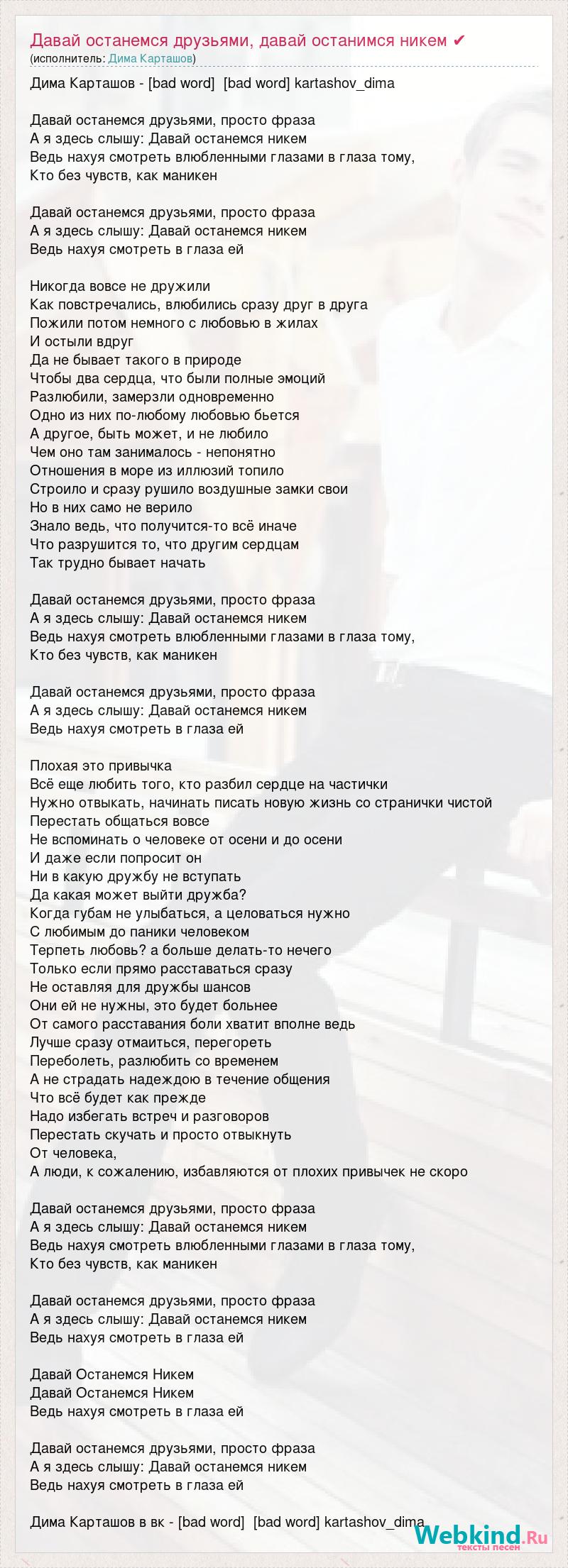 Дима Карташов - [bad word] [bad word] kartashov_dima Давай останемся друзьями, просто фраза А я здесь слышу: Давай останемся никем Ведь нахуя смотреть влюбленными глазами в глаза тому, Кто без чувств, как маникен Давай останемся друзьями, просто фраза А я здесь слышу: Давай останемся никем Ведь нахуя смотреть в глаза ей Никогда вовсе не дружили Как повстречались, влюбились сразу друг в друга Пожили потом немного с любовью в жилах И остыли вдруг Да не бывает такого в природе Чтобы два сердца, что были полные эмоций Разлюбили, замерзли одновременно Одно из них по-любому любовью бьется А другое, быть может, и не любило Чем оно там занималось - непонятно Отношения в море из иллюзий топило Строило и сразу рушило воздушные замки свои Но в них само не верило Знало ведь, что получится-то всё иначе Что разрушится то, что другим сердцам Так трудно бывает начать Давай останемся друзьями, просто фраза А я здесь слышу: Давай останемся никем Ведь нахуя смотреть влюбленными глазами в глаза тому, Кто без чувств, как маникен Давай останемся друзьями, просто фраза А я здесь слышу: Давай останемся никем Ведь нахуя смотреть в глаза ей Плохая это привычка Всё еще любить того, кто разбил сердце на частички Нужно отвыкать, начинать писать новую жизнь со странички чистой Перестать общаться вовсе Не вспоминать о человеке от осени и до осени И даже если попросит он Ни в какую дружбу не вступать Да какая может выйти дружба? Когда губам не улыбаться, а целоваться нужно С любимым до паники человеком Терпеть любовь? а больше делать-то нечего Только если прямо расставаться сразу Не оставляя для дружбы шансов Они ей не нужны, это будет больнее От самого расставания боли хватит вполне ведь Лучше сразу отмаиться, перегореть Переболеть, разлюбить со временем А не страдать надеждою в течение общения Что всё будет как прежде Надо избегать встреч и разговоров Перестать скучать и просто отвыкнуть От человека, А люди, к сожалению, избавляются от плохих привычек не скоро Давай останемся друзьями, просто фраза А я здесь слышу: Давай останемся никем Ведь нахуя смотреть влюбленными глазами в глаза тому, Кто без чувств, как маникен Давай останемся друзьями, просто фраза А я здесь слышу: Давай останемся никем Ведь нахуя смотреть в глаза ей Давай Останемся Никем Давай Останемся Никем Ведь нахуя смотреть в глаза ей Давай останемся друзьями, просто фраза А я здесь слышу: Давай останемся никем Ведь нахуя смотреть в глаза ей Дима Карташов в вк - [bad word] [bad word] kartashov_dima
