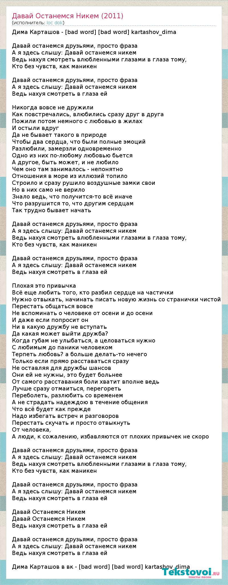 Дима Карташов - [bad word] [bad word] kartashov_dima Давай останемся друзьями, просто фраза А я здесь слышу: Давай останемся никем Ведь нахуя смотреть влюбленными глазами в глаза тому, Кто без чувств, как маникен Давай останемся друзьями, просто фраза А я здесь слышу: Давай останемся никем Ведь нахуя смотреть в глаза ей Никогда вовсе не дружили Как повстречались, влюбились сразу друг в друга Пожили потом немного с любовью в жилах И остыли вдруг Да не бывает такого в природе Чтобы два сердца, что были полные эмоций Разлюбили, замерзли одновременно Одно из них по-любому любовью бьется А другое, быть может, и не любило Чем оно там занималось - непонятно Отношения в море из иллюзий топило Строило и сразу рушило воздушные замки свои Но в них само не верило Знало ведь, что получится-то всё иначе Что разрушится то, что другим сердцам Так трудно бывает начать Давай останемся друзьями, просто фраза А я здесь слышу: Давай останемся никем Ведь нахуя смотреть влюбленными глазами в глаза тому, Кто без чувств, как маникен Давай останемся друзьями, просто фраза А я здесь слышу: Давай останемся никем Ведь нахуя смотреть в глаза ей Плохая это привычка Всё еще любить того, кто разбил сердце на частички Нужно отвыкать, начинать писать новую жизнь со странички чистой Перестать общаться вовсе Не вспоминать о человеке от осени и до осени И даже если попросит он Ни в какую дружбу не вступать Да какая может выйти дружба? Когда губам не улыбаться, а целоваться нужно С любимым до паники человеком Терпеть любовь? а больше делать-то нечего Только если прямо расставаться сразу Не оставляя для дружбы шансов Они ей не нужны, это будет больнее От самого расставания боли хватит вполне ведь Лучше сразу отмаиться, перегореть Переболеть, разлюбить со временем А не страдать надеждою в течение общения Что всё будет как прежде Надо избегать встреч и разговоров Перестать скучать и просто отвыкнуть От человека, А люди, к сожалению, избавляются от плохих привычек не скоро Давай останемся друзьями, просто фраза А я здесь слышу: Давай останемся никем Ведь нахуя смотреть влюбленными глазами в глаза тому, Кто без чувств, как маникен Давай останемся друзьями, просто фраза А я здесь слышу: Давай останемся никем Ведь нахуя смотреть в глаза ей Давай Останемся Никем Давай Останемся Никем Ведь нахуя смотреть в глаза ей Давай останемся друзьями, просто фраза А я здесь слышу: Давай останемся никем Ведь нахуя смотреть в глаза ей Дима Карташов в вк - [bad word] [bad word] kartashov_dima