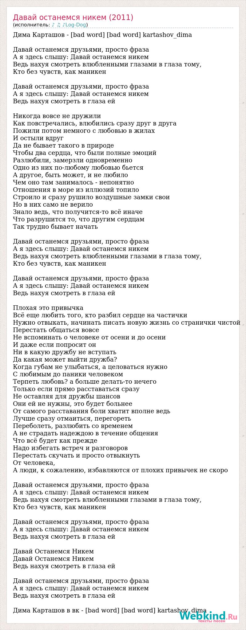 Дима Карташов - [bad word] [bad word] kartashov_dima Давай останемся друзьями, просто фраза А я здесь слышу: Давай останемся никем Ведь нахуя смотреть влюбленными глазами в глаза тому, Кто без чувств, как маникен Давай останемся друзьями, просто фраза А я здесь слышу: Давай останемся никем Ведь нахуя смотреть в глаза ей Никогда вовсе не дружили Как повстречались, влюбились сразу друг в друга Пожили потом немного с любовью в жилах И остыли вдруг Да не бывает такого в природе Чтобы два сердца, что были полные эмоций Разлюбили, замерзли одновременно Одно из них по-любому любовью бьется А другое, быть может, и не любило Чем оно там занималось - непонятно Отношения в море из иллюзий топило Строило и сразу рушило воздушные замки свои Но в них само не верило Знало ведь, что получится-то всё иначе Что разрушится то, что другим сердцам Так трудно бывает начать Давай останемся друзьями, просто фраза А я здесь слышу: Давай останемся никем Ведь нахуя смотреть влюбленными глазами в глаза тому, Кто без чувств, как маникен Давай останемся друзьями, просто фраза А я здесь слышу: Давай останемся никем Ведь нахуя смотреть в глаза ей Плохая это привычка Всё еще любить того, кто разбил сердце на частички Нужно отвыкать, начинать писать новую жизнь со странички чистой Перестать общаться вовсе Не вспоминать о человеке от осени и до осени И даже если попросит он Ни в какую дружбу не вступать Да какая может выйти дружба? Когда губам не улыбаться, а целоваться нужно С любимым до паники человеком Терпеть любовь? а больше делать-то нечего Только если прямо расставаться сразу Не оставляя для дружбы шансов Они ей не нужны, это будет больнее От самого расставания боли хватит вполне ведь Лучше сразу отмаиться, перегореть Переболеть, разлюбить со временем А не страдать надеждою в течение общения Что всё будет как прежде Надо избегать встреч и разговоров Перестать скучать и просто отвыкнуть От человека, А люди, к сожалению, избавляются от плохих привычек не скоро Давай останемся друзьями, просто фраза А я здесь слышу: Давай останемся никем Ведь нахуя смотреть влюбленными глазами в глаза тому, Кто без чувств, как маникен Давай останемся друзьями, просто фраза А я здесь слышу: Давай останемся никем Ведь нахуя смотреть в глаза ей Давай Останемся Никем Давай Останемся Никем Ведь нахуя смотреть в глаза ей Давай останемся друзьями, просто фраза А я здесь слышу: Давай останемся никем Ведь нахуя смотреть в глаза ей Дима Карташов в вк - [bad word] [bad word] kartashov_dima