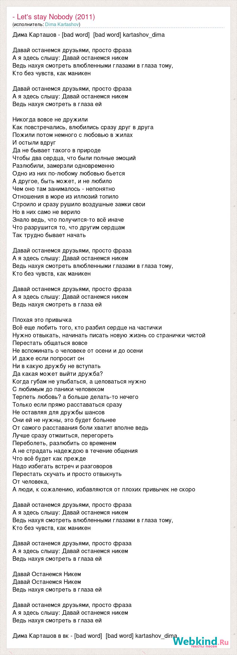 Дима Карташов - [bad word] [bad word] kartashov_dima Давай останемся друзьями, просто фраза А я здесь слышу: Давай останемся никем Ведь нахуя смотреть влюбленными глазами в глаза тому, Кто без чувств, как маникен Давай останемся друзьями, просто фраза А я здесь слышу: Давай останемся никем Ведь нахуя смотреть в глаза ей Никогда вовсе не дружили Как повстречались, влюбились сразу друг в друга Пожили потом немного с любовью в жилах И остыли вдруг Да не бывает такого в природе Чтобы два сердца, что были полные эмоций Разлюбили, замерзли одновременно Одно из них по-любому любовью бьется А другое, быть может, и не любило Чем оно там занималось - непонятно Отношения в море из иллюзий топило Строило и сразу рушило воздушные замки свои Но в них само не верило Знало ведь, что получится-то всё иначе Что разрушится то, что другим сердцам Так трудно бывает начать Давай останемся друзьями, просто фраза А я здесь слышу: Давай останемся никем Ведь нахуя смотреть влюбленными глазами в глаза тому, Кто без чувств, как маникен Давай останемся друзьями, просто фраза А я здесь слышу: Давай останемся никем Ведь нахуя смотреть в глаза ей Плохая это привычка Всё еще любить того, кто разбил сердце на частички Нужно отвыкать, начинать писать новую жизнь со странички чистой Перестать общаться вовсе Не вспоминать о человеке от осени и до осени И даже если попросит он Ни в какую дружбу не вступать Да какая может выйти дружба? Когда губам не улыбаться, а целоваться нужно С любимым до паники человеком Терпеть любовь? а больше делать-то нечего Только если прямо расставаться сразу Не оставляя для дружбы шансов Они ей не нужны, это будет больнее От самого расставания боли хватит вполне ведь Лучше сразу отмаиться, перегореть Переболеть, разлюбить со временем А не страдать надеждою в течение общения Что всё будет как прежде Надо избегать встреч и разговоров Перестать скучать и просто отвыкнуть От человека, А люди, к сожалению, избавляются от плохих привычек не скоро Давай останемся друзьями, просто фраза А я здесь слышу: Давай останемся никем Ведь нахуя смотреть влюбленными глазами в глаза тому, Кто без чувств, как маникен Давай останемся друзьями, просто фраза А я здесь слышу: Давай останемся никем Ведь нахуя смотреть в глаза ей Давай Останемся Никем Давай Останемся Никем Ведь нахуя смотреть в глаза ей Давай останемся друзьями, просто фраза А я здесь слышу: Давай останемся никем Ведь нахуя смотреть в глаза ей Дима Карташов в вк - [bad word] [bad word] kartashov_dima