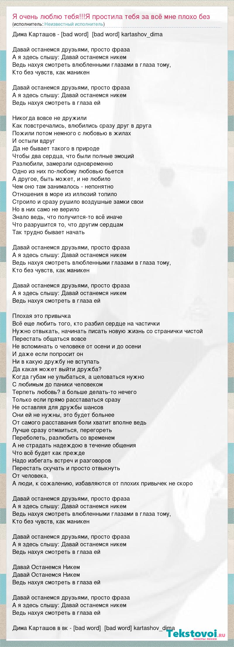Дима Карташов - [bad word] [bad word] kartashov_dima Давай останемся друзьями, просто фраза А я здесь слышу: Давай останемся никем Ведь нахуя смотреть влюбленными глазами в глаза тому, Кто без чувств, как маникен Давай останемся друзьями, просто фраза А я здесь слышу: Давай останемся никем Ведь нахуя смотреть в глаза ей Никогда вовсе не дружили Как повстречались, влюбились сразу друг в друга Пожили потом немного с любовью в жилах И остыли вдруг Да не бывает такого в природе Чтобы два сердца, что были полные эмоций Разлюбили, замерзли одновременно Одно из них по-любому любовью бьется А другое, быть может, и не любило Чем оно там занималось - непонятно Отношения в море из иллюзий топило Строило и сразу рушило воздушные замки свои Но в них само не верило Знало ведь, что получится-то всё иначе Что разрушится то, что другим сердцам Так трудно бывает начать Давай останемся друзьями, просто фраза А я здесь слышу: Давай останемся никем Ведь нахуя смотреть влюбленными глазами в глаза тому, Кто без чувств, как маникен Давай останемся друзьями, просто фраза А я здесь слышу: Давай останемся никем Ведь нахуя смотреть в глаза ей Плохая это привычка Всё еще любить того, кто разбил сердце на частички Нужно отвыкать, начинать писать новую жизнь со странички чистой Перестать общаться вовсе Не вспоминать о человеке от осени и до осени И даже если попросит он Ни в какую дружбу не вступать Да какая может выйти дружба? Когда губам не улыбаться, а целоваться нужно С любимым до паники человеком Терпеть любовь? а больше делать-то нечего Только если прямо расставаться сразу Не оставляя для дружбы шансов Они ей не нужны, это будет больнее От самого расставания боли хватит вполне ведь Лучше сразу отмаиться, перегореть Переболеть, разлюбить со временем А не страдать надеждою в течение общения Что всё будет как прежде Надо избегать встреч и разговоров Перестать скучать и просто отвыкнуть От человека, А люди, к сожалению, избавляются от плохих привычек не скоро Давай останемся друзьями, просто фраза А я здесь слышу: Давай останемся никем Ведь нахуя смотреть влюбленными глазами в глаза тому, Кто без чувств, как маникен Давай останемся друзьями, просто фраза А я здесь слышу: Давай останемся никем Ведь нахуя смотреть в глаза ей Давай Останемся Никем Давай Останемся Никем Ведь нахуя смотреть в глаза ей Давай останемся друзьями, просто фраза А я здесь слышу: Давай останемся никем Ведь нахуя смотреть в глаза ей Дима Карташов в вк - [bad word] [bad word] kartashov_dima
