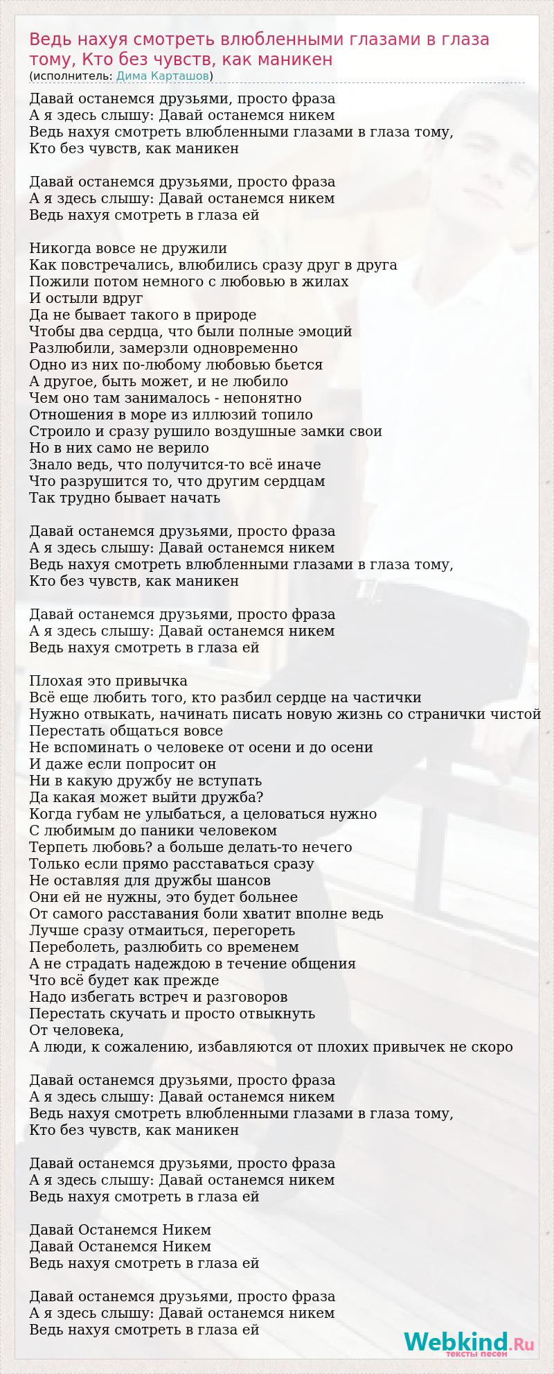 Давай останемся друзьями, просто фраза А я здесь слышу: Давай останемся никем Ведь нахуя смотреть влюбленными глазами в глаза тому, Кто без чувств, как маникен Давай останемся друзьями, просто фраза А я здесь слышу: Давай останемся никем Ведь нахуя смотреть в глаза ей Никогда вовсе не дружили Как повстречались, влюбились сразу друг в друга Пожили потом немного с любовью в жилах И остыли вдруг Да не бывает такого в природе Чтобы два сердца, что были полные эмоций Разлюбили, замерзли одновременно Одно из них по-любому любовью бьется А другое, быть может, и не любило Чем оно там занималось - непонятно Отношения в море из иллюзий топило Строило и сразу рушило воздушные замки свои Но в них само не верило Знало ведь, что получится-то всё иначе Что разрушится то, что другим сердцам Так трудно бывает начать Давай останемся друзьями, просто фраза А я здесь слышу: Давай останемся никем Ведь нахуя смотреть влюбленными глазами в глаза тому, Кто без чувств, как маникен Давай останемся друзьями, просто фраза А я здесь слышу: Давай останемся никем Ведь нахуя смотреть в глаза ей Плохая это привычка Всё еще любить того, кто разбил сердце на частички Нужно отвыкать, начинать писать новую жизнь со странички чистой Перестать общаться вовсе Не вспоминать о человеке от осени и до осени И даже если попросит он Ни в какую дружбу не вступать Да какая может выйти дружба? Когда губам не улыбаться, а целоваться нужно С любимым до паники человеком Терпеть любовь? а больше делать-то нечего Только если прямо расставаться сразу Не оставляя для дружбы шансов Они ей не нужны, это будет больнее От самого расставания боли хватит вполне ведь Лучше сразу отмаиться, перегореть Переболеть, разлюбить со временем А не страдать надеждою в течение общения Что всё будет как прежде Надо избегать встреч и разговоров Перестать скучать и просто отвыкнуть От человека, А люди, к сожалению, избавляются от плохих привычек не скоро Давай останемся друзьями, просто фраза А я здесь слышу: Давай останемся никем Ведь нахуя смотреть влюбленными глазами в глаза тому, Кто без чувств, как маникен Давай останемся друзьями, просто фраза А я здесь слышу: Давай останемся никем Ведь нахуя смотреть в глаза ей Давай Останемся Никем Давай Останемся Никем Ведь нахуя смотреть в глаза ей Давай останемся друзьями, просто фраза А я здесь слышу: Давай останемся никем Ведь нахуя смотреть в глаза ей