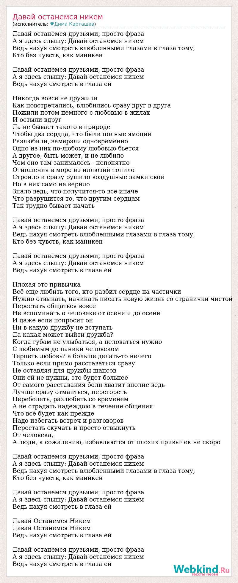 Давай останемся друзьями, просто фраза А я здесь слышу: Давай останемся никем Ведь нахуя смотреть влюбленными глазами в глаза тому, Кто без чувств, как маникен Давай останемся друзьями, просто фраза А я здесь слышу: Давай останемся никем Ведь нахуя смотреть в глаза ей Никогда вовсе не дружили Как повстречались, влюбились сразу друг в друга Пожили потом немного с любовью в жилах И остыли вдруг Да не бывает такого в природе Чтобы два сердца, что были полные эмоций Разлюбили, замерзли одновременно Одно из них по-любому любовью бьется А другое, быть может, и не любило Чем оно там занималось - непонятно Отношения в море из иллюзий топило Строило и сразу рушило воздушные замки свои Но в них само не верило Знало ведь, что получится-то всё иначе Что разрушится то, что другим сердцам Так трудно бывает начать Давай останемся друзьями, просто фраза А я здесь слышу: Давай останемся никем Ведь нахуя смотреть влюбленными глазами в глаза тому, Кто без чувств, как маникен Давай останемся друзьями, просто фраза А я здесь слышу: Давай останемся никем Ведь нахуя смотреть в глаза ей Плохая это привычка Всё еще любить того, кто разбил сердце на частички Нужно отвыкать, начинать писать новую жизнь со странички чистой Перестать общаться вовсе Не вспоминать о человеке от осени и до осени И даже если попросит он Ни в какую дружбу не вступать Да какая может выйти дружба? Когда губам не улыбаться, а целоваться нужно С любимым до паники человеком Терпеть любовь? а больше делать-то нечего Только если прямо расставаться сразу Не оставляя для дружбы шансов Они ей не нужны, это будет больнее От самого расставания боли хватит вполне ведь Лучше сразу отмаиться, перегореть Переболеть, разлюбить со временем А не страдать надеждою в течение общения Что всё будет как прежде Надо избегать встреч и разговоров Перестать скучать и просто отвыкнуть От человека, А люди, к сожалению, избавляются от плохих привычек не скоро Давай останемся друзьями, просто фраза А я здесь слышу: Давай останемся никем Ведь нахуя смотреть влюбленными глазами в глаза тому, Кто без чувств, как маникен Давай останемся друзьями, просто фраза А я здесь слышу: Давай останемся никем Ведь нахуя смотреть в глаза ей Давай Останемся Никем Давай Останемся Никем Ведь нахуя смотреть в глаза ей Давай останемся друзьями, просто фраза А я здесь слышу: Давай останемся никем Ведь нахуя смотреть в глаза ей