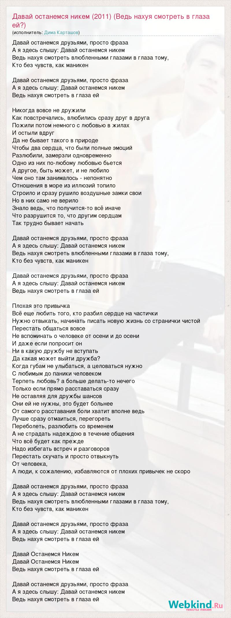 Давай останемся друзьями, просто фраза А я здесь слышу: Давай останемся никем Ведь нахуя смотреть влюбленными глазами в глаза тому, Кто без чувств, как маникен Давай останемся друзьями, просто фраза А я здесь слышу: Давай останемся никем Ведь нахуя смотреть в глаза ей Никогда вовсе не дружили Как повстречались, влюбились сразу друг в друга Пожили потом немного с любовью в жилах И остыли вдруг Да не бывает такого в природе Чтобы два сердца, что были полные эмоций Разлюбили, замерзли одновременно Одно из них по-любому любовью бьется А другое, быть может, и не любило Чем оно там занималось - непонятно Отношения в море из иллюзий топило Строило и сразу рушило воздушные замки свои Но в них само не верило Знало ведь, что получится-то всё иначе Что разрушится то, что другим сердцам Так трудно бывает начать Давай останемся друзьями, просто фраза А я здесь слышу: Давай останемся никем Ведь нахуя смотреть влюбленными глазами в глаза тому, Кто без чувств, как маникен Давай останемся друзьями, просто фраза А я здесь слышу: Давай останемся никем Ведь нахуя смотреть в глаза ей Плохая это привычка Всё еще любить того, кто разбил сердце на частички Нужно отвыкать, начинать писать новую жизнь со странички чистой Перестать общаться вовсе Не вспоминать о человеке от осени и до осени И даже если попросит он Ни в какую дружбу не вступать Да какая может выйти дружба? Когда губам не улыбаться, а целоваться нужно С любимым до паники человеком Терпеть любовь? а больше делать-то нечего Только если прямо расставаться сразу Не оставляя для дружбы шансов Они ей не нужны, это будет больнее От самого расставания боли хватит вполне ведь Лучше сразу отмаиться, перегореть Переболеть, разлюбить со временем А не страдать надеждою в течение общения Что всё будет как прежде Надо избегать встреч и разговоров Перестать скучать и просто отвыкнуть От человека, А люди, к сожалению, избавляются от плохих привычек не скоро Давай останемся друзьями, просто фраза А я здесь слышу: Давай останемся никем Ведь нахуя смотреть влюбленными глазами в глаза тому, Кто без чувств, как маникен Давай останемся друзьями, просто фраза А я здесь слышу: Давай останемся никем Ведь нахуя смотреть в глаза ей Давай Останемся Никем Давай Останемся Никем Ведь нахуя смотреть в глаза ей Давай останемся друзьями, просто фраза А я здесь слышу: Давай останемся никем Ведь нахуя смотреть в глаза ей