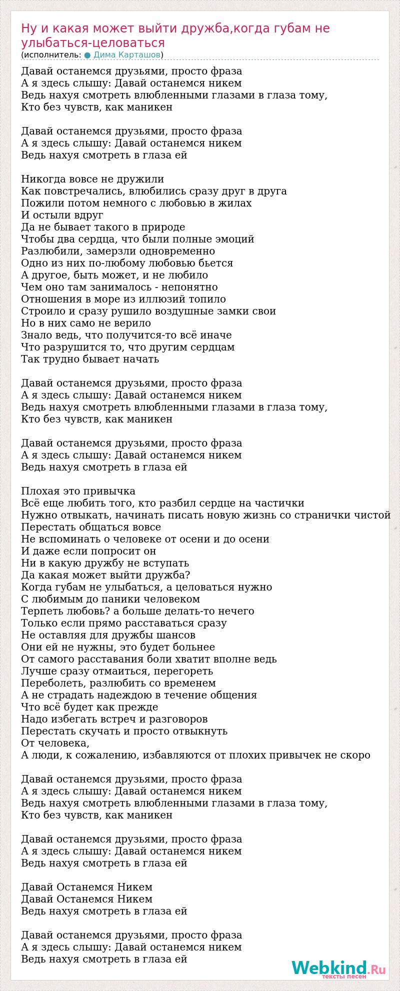 Давай останемся друзьями, просто фраза А я здесь слышу: Давай останемся никем Ведь нахуя смотреть влюбленными глазами в глаза тому, Кто без чувств, как маникен Давай останемся друзьями, просто фраза А я здесь слышу: Давай останемся никем Ведь нахуя смотреть в глаза ей Никогда вовсе не дружили Как повстречались, влюбились сразу друг в друга Пожили потом немного с любовью в жилах И остыли вдруг Да не бывает такого в природе Чтобы два сердца, что были полные эмоций Разлюбили, замерзли одновременно Одно из них по-любому любовью бьется А другое, быть может, и не любило Чем оно там занималось - непонятно Отношения в море из иллюзий топило Строило и сразу рушило воздушные замки свои Но в них само не верило Знало ведь, что получится-то всё иначе Что разрушится то, что другим сердцам Так трудно бывает начать Давай останемся друзьями, просто фраза А я здесь слышу: Давай останемся никем Ведь нахуя смотреть влюбленными глазами в глаза тому, Кто без чувств, как маникен Давай останемся друзьями, просто фраза А я здесь слышу: Давай останемся никем Ведь нахуя смотреть в глаза ей Плохая это привычка Всё еще любить того, кто разбил сердце на частички Нужно отвыкать, начинать писать новую жизнь со странички чистой Перестать общаться вовсе Не вспоминать о человеке от осени и до осени И даже если попросит он Ни в какую дружбу не вступать Да какая может выйти дружба? Когда губам не улыбаться, а целоваться нужно С любимым до паники человеком Терпеть любовь? а больше делать-то нечего Только если прямо расставаться сразу Не оставляя для дружбы шансов Они ей не нужны, это будет больнее От самого расставания боли хватит вполне ведь Лучше сразу отмаиться, перегореть Переболеть, разлюбить со временем А не страдать надеждою в течение общения Что всё будет как прежде Надо избегать встреч и разговоров Перестать скучать и просто отвыкнуть От человека, А люди, к сожалению, избавляются от плохих привычек не скоро Давай останемся друзьями, просто фраза А я здесь слышу: Давай останемся никем Ведь нахуя смотреть влюбленными глазами в глаза тому, Кто без чувств, как маникен Давай останемся друзьями, просто фраза А я здесь слышу: Давай останемся никем Ведь нахуя смотреть в глаза ей Давай Останемся Никем Давай Останемся Никем Ведь нахуя смотреть в глаза ей Давай останемся друзьями, просто фраза А я здесь слышу: Давай останемся никем Ведь нахуя смотреть в глаза ей