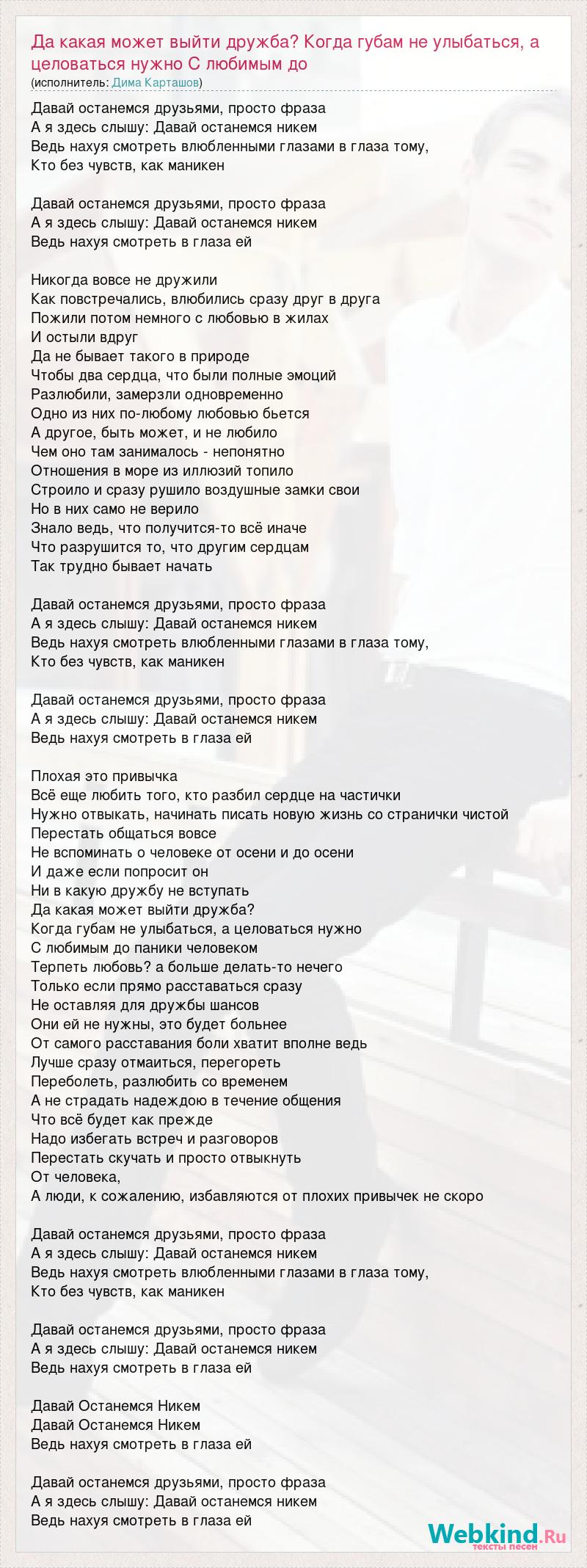 Главная→Исполнители→Дима Карташов→Да какая может выйти дружба? Когда губам не улыбаться, а целоваться нужно
