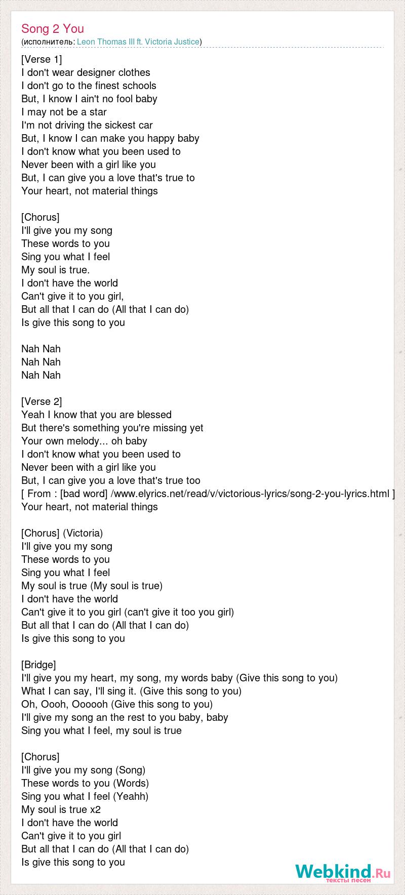 [Verse 1] I don't wear designer clothes I don't go to the finest schools But, I know I ain't no fool baby I may not be a star I'm not driving the sickest car But, I know I can make you happy baby I don't know what you been used to Never been with a girl like you But, I can give you a love that's true to Your heart, not material things [Chorus] I'll give you my song These words to you Sing you what I feel My soul is true. I don't have the world Can't give it to you girl, But all that I can do (All that I can do) Is give this song to you Nah Nah Nah Nah Nah Nah [Verse 2] Yeah I know that you are blessed But there's something you're missing yet Your own melody... oh baby I don't know what you been used to Never been with a girl like you But, I can give you a love that's true too [ From : [bad word] /www.elyrics.net/read/v/victorious-lyrics/song-2-you-lyrics.html ] Your heart, not material things [Chorus] (Victoria) I'll give you my song These words to you Sing you what I feel My soul is true (My soul is true) I don't have the world Can't give it to you girl (can't give it too you girl) But all that I can do (All that I can do) Is give this song to you [Bridge] I'll give you my heart, my song, my words baby (Give this song to you) What I can say, I'll sing it. (Give this song to you) Oh, Oooh, Oooooh (Give this song to you) I'll give my song an the rest to you baby, baby Sing you what I feel, my soul is true [Chorus] I'll give you my song (Song) These words to you (Words) Sing you what I feel (Yeahh) My soul is true x2 I don't have the world Can't give it to you girl But all that I can do (All that I can do) Is give this song to you
