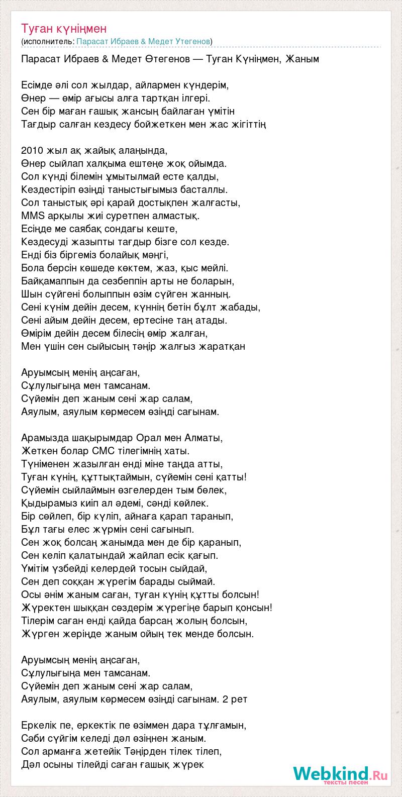Парасат Ибраев & Медет Өтегенов — Туған Күніңмен, Жаным Есімде әлі сол жылдар, айлармен күндерім, Өнер — өмір ағысы алға тартқан ілгері. Сен бір маған ғашық жансың байлаған үмітін Тағдыр салған кездесу бойжеткен мен жас жігіттің 2010 жыл ақ жайық алаңында, Өнер сыйлап халқыма ештеңе жоқ ойымда. Сол күнді білемін ұмытылмай есте қалды, Кездестіріп өзіңді таныстығымыз басталлы. Сол таныстық әрі қарай достықпен жалғасты, ММS арқылы жиі суретпен алмастық. Есіңде ме саябақ сондағы кеште, Кездесуді жазыпты тағдыр бізге сол кезде. Енді біз біргеміз болайық мәңгі, Бола берсін көшеде көктем, жаз, қыс мейлі. Байқамаппын да сезбеппін арты не боларын, Шын сүйгені болыппын өзім сүйген жанның. Сені күнім дейін десем, күннің бетін бұлт жабады, Сені айым дейін десем, ертесіне таң атады. Өмірім дейін десем білесің өмір жалған, Мен үшін сен сыйысың тәңір жалғыз жаратқан Аруымсың менің аңсаған, Сұлулығыңа мен тамсанам. Сүйемін деп жаным сені жар салам, Аяулым, аяулым көрмесем өзіңді сағынам. Арамызда шақырымдар Орал мен Алматы, Жеткен болар СМС тілегімнің хаты. Түніменен жазылған енді міне таңда атты, Туған күнің, құттықтаймын, сүйемін сені қатты! Сүйемін сыйлаймын өзгелерден тым бөлек, Қыдырамыз киіп ал әдемі, сәнді көйлек. Бір сөйлеп, бір күліп, айнаға қарап таранып, Бұл тағы елес жүрмін сені сағынып. Сен жоқ болсаң жанымда мен де бір қаранып, Сен келіп қалатындай жайлап есік қағып. Үмітім үзбейді келердей тосын сыйдай, Сен деп соққан жүрегім барады сыймай. Осы әнім жаным саған, туған күнің құтты болсын! Жүректен шыққан сөздерім жүрегіңе барып қонсын! Тілерім саған енді қайда барсаң жолың болсын, Жүрген жеріңде жаным ойың тек менде болсын. Аруымсың менің аңсаған, Сұлулығыңа мен тамсанам. Сүйемін деп жаным сені жар салам, Аяулым, аяулым көрмесем өзіңді сағынам. 2 рет Еркелік пе, еркектік пе өзіммен дара тұлғамын, Сәби сүйгім келеді дәл өзіңнен жаным. Сол арманға жетейік Тәңірден тілек тілеп, Дәл осыны тілейді саған ғашық жүрек
