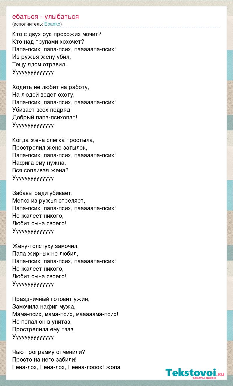 Кто с двух рук прохожих мочит? Кто над трупами хохочет? Папа-псих, папа-псих, пааааапа-псих! Из ружья жену убил, Тещу ядом отравил, Уууууууууууууу Ходить не любит на работу, На людей ведет охоту, Папа-псих, папа-псих, пааааапа-псих! Убивает всех подряд Добрый папа-психопат! Уууууууууууууу Когда жена слегка простыла, Прострелил жене затылок, Папа-псих, папа-псих, пааааапа-псих! Нафига ему нужна, Вся сопливая жена? Уууууууууууууу Забавы ради убивает, Метко из ружья стреляет, Папа-псих, папа-псих, пааааапа-псих! Не жалеет никого, Любит сына своего! Уууууууууууууу Жену-толстуху замочил, Папа жирных не любил, Папа-псих, папа-псих, пааааапа-псих! Не жалеет никого, Любит сына своего! Уууууууууууууу Праздничный готовит ужин, Замочила нафиг мужа, Мама-псих, мама-псих, мааааама-псих! Не попал он в унитаз, Прострелила ему глаз Уууууууууууууу Чью программу отменили? Просто на него забили! Гена-лох, Гена-лох, Геена-лооох! жопа