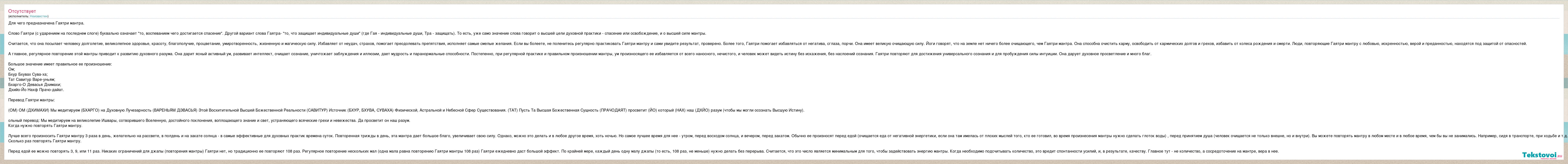 Для чего предназначена Гаятри мантра. Слово Гаятри (с ударением на последнем слоге) буквально означает "то, воспеванием чего достигается спасение". Другой вариант слова Гаятра- "то, что защищает индивидуальные души" (где Гая - индивидуальные души, Тра - защищать). То есть, уже само значение слова говорит о высшей цели духовной практики - спасение или освобождение, и о высшей силе мантры. Считается, что она посылает человеку долголетие, великолепное здоровье, красоту, благополучие, процветание, умиротворенность, жизненную и магическую силу. Избавляет от неудач, страхов, помогает преодолевать препятствия, исполняет самые смелые желания. Если вы болеете, не поленитесь регулярно практиковать Гаятри мантру и сами увидите результат, проверено. Более того, Гаятри помогает избавляться от негатива, сглаза, порчи. Она имеет великую очищающую силу. Йоги говорят, что на земле нет ничего более очищающего, чем Гаятри мантра. Она способна очистить карму, освободить от кармических долгов и грехов, избавить от колеса рождения и смерти. Люди, повторяющие Гаятри мантру с любовью, искренностью, верой и преданностью, находятся под защитой от опасностей. А главное, регулярное повторение этой мантры приводит к развитию духовного разума. Она дарит ясный активный ум, развивает интеллект, очищает сознание, уничтожает заблуждения и иллюзии, дает мудрость и паранормальные способности. Постепенно, при регулярной практике и правильном произношении мантры, ум произносящего ее избавляется от всего наносного, нечистого, и человек может видеть истину без искажения, без наслоений сознания. Гаятри повторяют для достижения универсального сознания и для пробуждения силы интуиции. Она дарует духовное просветление и много благ. Большое значение имеет правильное ее произношение: Ом; Бхур Бхувах Сува-ха; Тат Савитур Варе-уньям; Бхарго-О Девасья Дхимахи; Дхийо-Йо Нахф Прачо-дайат. Перевод Гаятри мантры: (ОМ) ОМ (ДХИМАХИ) Мы медитируем (БХАРГО) на Духовную Лучезарность (ВАРЕНЬЯМ ДЭВАСЬЯ) Этой Восхитительной Высшей Божественной Реальности (САВИТУР) Источник (БХУР, БХУВА, СУВАХА) Физической, Астральной и Небесной Сфер Существования. (ТАТ) Пусть Та Высшая Божественная Сущность (ПРАЧОДАЯТ) просветит (ЙО) который (НАХ) наш (ДХЙО) разум (чтобы мы могли осознать Высшую Истину). ольный перевод: Мы медитируем на великолепие Ишвары, сотворившего Вселенную, достойного поклонения, воплощающего знание и свет, устраняющего всяческие грехи и невежества. Да просветит он наш разум. Когда нужно повторять Гаятри мантру. Лучше всего произносить Гаятри мантру 3 раза в день, желательно на рассвете, в полдень и на закате солнца - в самые эффективные для духовных практик времена суток. Повторенная трижды в день, эта мантра дает большое благо, увеличивает свою силу. Однако, можно это делать и в любое другое время, хоть ночью. Но самое лучшее время для нее - утром, перед восходом солнца, и вечером, перед закатом. Обычно ее произносят перед едой (очищается еда от негативной энергетики, если она там имелась от плохих мыслей того, кто ее готовил, во время произнесения мантры нужно сделать глоток воды) , перед принятием душа (человек очищается не только внешне, но и внутри). Вы можете повторять мантру в любом месте и в любое время, чем бы вы не занимались. Например, сидя в транспорте, при ходьбе и т.д. Сколько раз п
