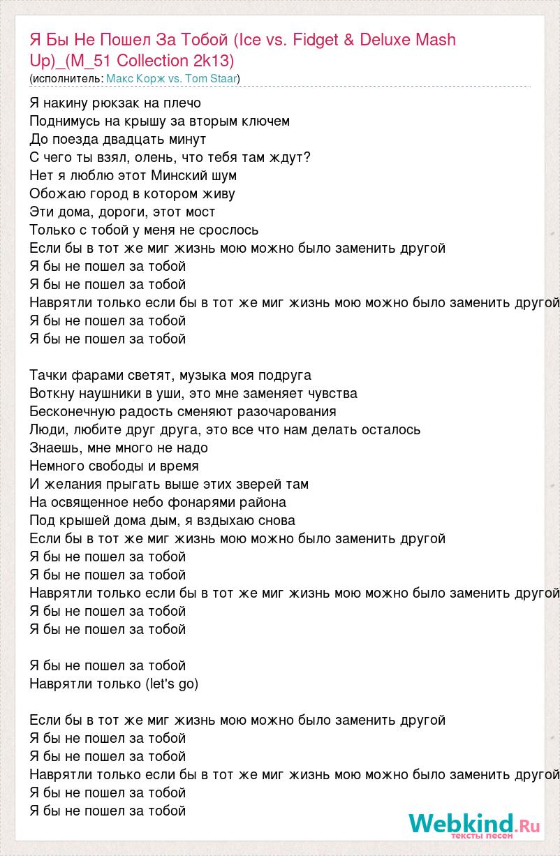 Я накину рюкзак на плечо Поднимусь на крышу за вторым ключем До поезда двадцать минут С чего ты взял, олень, что тебя там ждут? Нет я люблю этот Минский шум Обожаю город в котором живу Эти дома, дороги, этот мост Только с тобой у меня не срослось Если бы в тот же миг жизнь мою можно было заменить другой Я бы не пошел за тобой Я бы не пошел за тобой Наврятли только если бы в тот же миг жизнь мою можно было заменить другой Я бы не пошел за тобой Я бы не пошел за тобой Тачки фарами светят, музыка моя подруга Воткну наушники в уши, это мне заменяет чувства Бесконечную радость сменяют разочарования Люди, любите друг друга, это все что нам делать осталось Знаешь, мне много не надо Немного свободы и время И желания прыгать выше этих зверей там На освященное небо фонарями района Под крышей дома дым, я вздыхаю снова Если бы в тот же миг жизнь мою можно было заменить другой Я бы не пошел за тобой Я бы не пошел за тобой Наврятли только если бы в тот же миг жизнь мою можно было заменить другой Я бы не пошел за тобой Я бы не пошел за тобой Я бы не пошел за тобой Наврятли только (let's go) Если бы в тот же миг жизнь мою можно было заменить другой Я бы не пошел за тобой Я бы не пошел за тобой Наврятли только если бы в тот же миг жизнь мою можно было заменить другой Я бы не пошел за тобой Я бы не пошел за тобой
