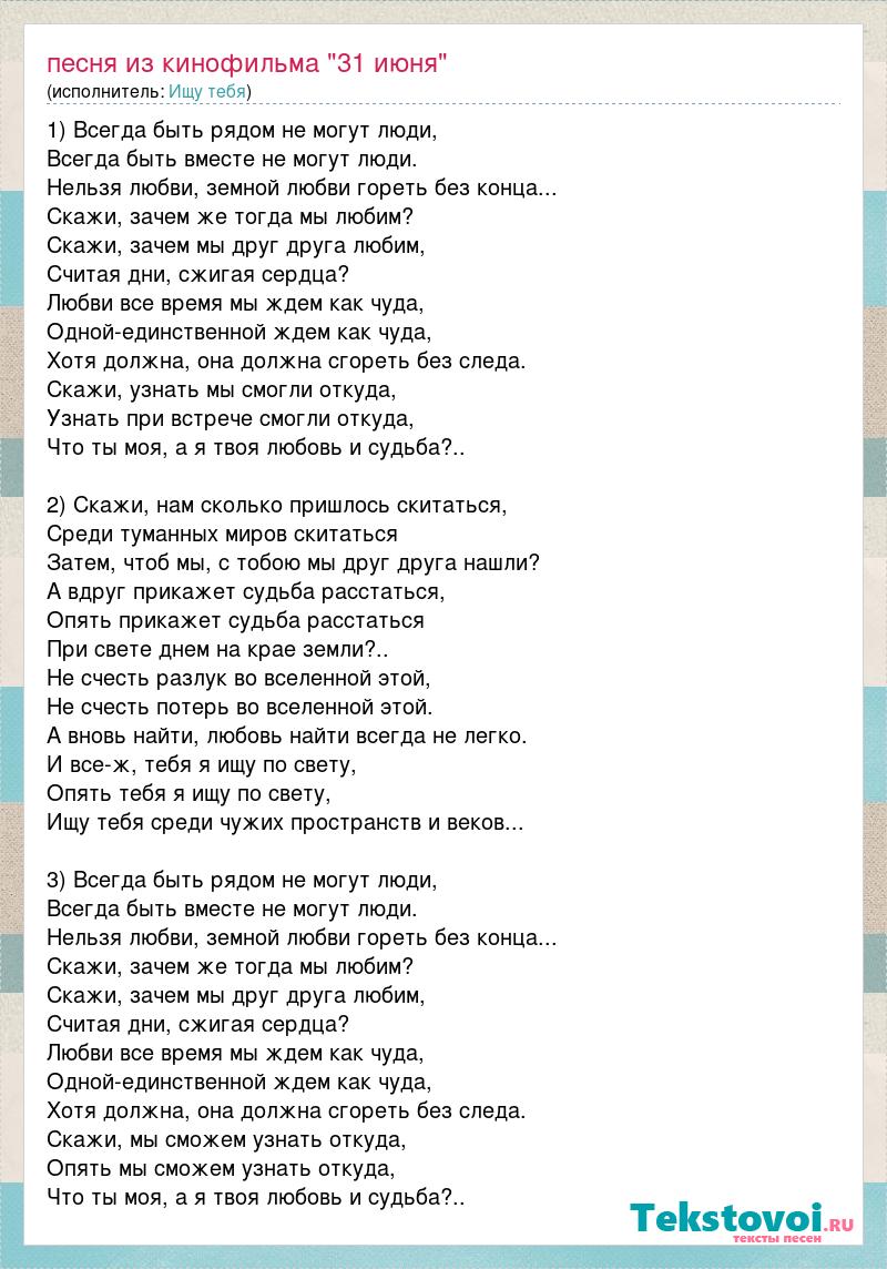 1) Всегда быть рядом не могут люди, Всегда быть вместе не могут люди. Нельзя любви, земной любви гореть без конца... Скажи, зачем же тогда мы любим? Скажи, зачем мы друг друга любим, Считая дни, сжигая сердца? Любви все время мы ждем как чуда, Одной-единственной ждем как чуда, Хотя должна, она должна сгореть без следа. Скажи, узнать мы смогли откуда, Узнать при встрече смогли откуда, Что ты моя, а я твоя любовь и судьба?.. 2) Скажи, нам сколько пришлось скитаться, Среди туманных миров скитаться Затем, чтоб мы, с тобою мы друг друга нашли? А вдруг прикажет судьба расстаться, Опять прикажет судьба расстаться При свете днем на крае земли?.. Не счесть разлук во вселенной этой, Не счесть потерь во вселенной этой. А вновь найти, любовь найти всегда не легко. И все-ж, тебя я ищу по свету, Опять тебя я ищу по свету, Ищу тебя среди чужих пространств и веков... 3) Всегда быть рядом не могут люди, Всегда быть вместе не могут люди. Нельзя любви, земной любви гореть без конца... Скажи, зачем же тогда мы любим? Скажи, зачем мы друг друга любим, Считая дни, сжигая сердца? Любви все время мы ждем как чуда, Одной-единственной ждем как чуда, Хотя должна, она должна сгореть без следа. Скажи, мы сможем узнать откуда, Опять мы сможем узнать откуда, Что ты моя, а я твоя любовь и судьба?..