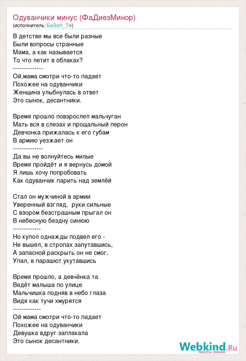 В детстве мы все были разные Были вопросы странные Мама, а как называется То что летит в облаках? -------------- Ой,мама смотри что-то падает Похожее на одуванчики Женщина улыбнулась в ответ Это сынок, десантники. Время прошло повзрослел мальчуган Мать вся в слезах и прощальный перон Девчонка прижалась к его губам В армию уезжает он -------------- Да вы не волнуйтесь милые Время пройдёт и я вернусь домой Я лишь хочу попробовать Как одуванчик парить над землёй Стал он мужчиной в армии Уверенный взгляд, руки сильные С взором безстрашным прыгал он В небесную бездну синюю ------------- Но купол однажды подвел его - Не вышел, в стропах запутавшись, А запасной раскрыть он не смог. Упал, в парашют укутавшись Время прошло, а девчёнка та Ведёт малыша по улице Мальчишка подняв в небо глаза Видя как тучи хмурятся ------------- Ой мама смотри что-то падает Похожее на одуванчики Девушка вдруг заплакала Это сынок десантники.