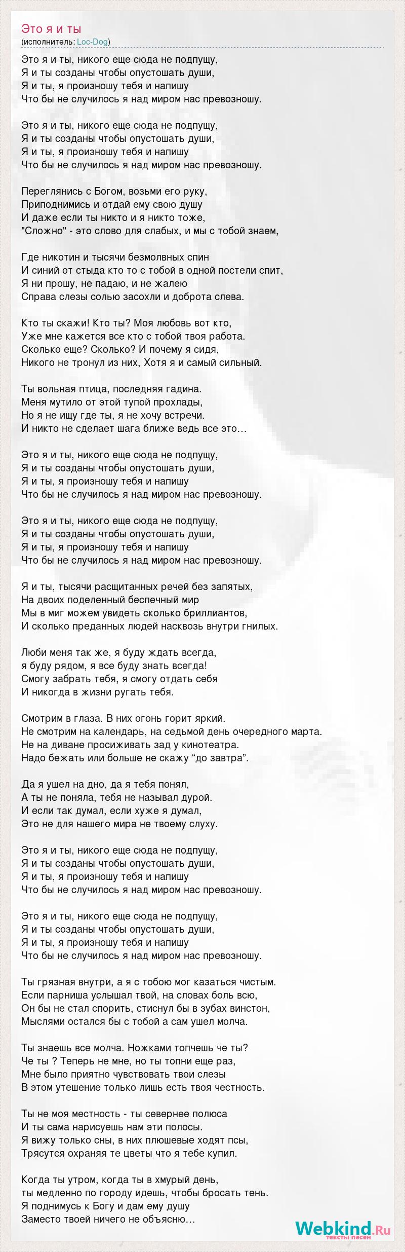 Это я и ты, никого еще сюда не подпущу, Я и ты созданы чтобы опустошать души, Я и ты, я произношу тебя и напишу Что бы не случилось я над миром нас превозношу. Это я и ты, никого еще сюда не подпущу, Я и ты созданы чтобы опустошать души, Я и ты, я произношу тебя и напишу Что бы не случилось я над миром нас превозношу. Переглянись с Богом, возьми его руку, Приподнимись и отдай ему свою душу И даже если ты никто и я никто тоже, "Сложно" - это слово для слабых, и мы с тобой знаем, Где никотин и тысячи безмолвных спин И синий от стыда кто то с тобой в одной постели спит, Я ни прошу, не падаю, и не жалею Справа слезы солью засохли и доброта слева. Кто ты скажи! Кто ты? Моя любовь вот кто, Уже мне кажется все кто с тобой твоя работа. Сколько еще? Сколько? И почему я сидя, Никого не тронул из них, Хотя я и самый сильный. Ты вольная птица, последняя гадина. Меня мутило от этой тупой прохлады, Но я не ищу где ты, я не хочу встречи. И никто не сделает шага ближе ведь все это… Это я и ты, никого еще сюда не подпущу, Я и ты созданы чтобы опустошать души, Я и ты, я произношу тебя и напишу Что бы не случилось я над миром нас превозношу. Это я и ты, никого еще сюда не подпущу, Я и ты созданы чтобы опустошать души, Я и ты, я произношу тебя и напишу Что бы не случилось я над миром нас превозношу. Я и ты, тысячи расщитанных речей без запятых, На двоих поделенный беспечный мир Мы в миг можем увидеть сколько бриллиантов, И сколько преданных людей насквозь внутри гнилых. Люби меня так же, я буду ждать всегда, я буду рядом, я все буду знать всегда! Смогу забрать тебя, я смогу отдать себя И никогда в жизни ругать тебя. Смотрим в глаза. В них огонь горит яркий. Не смотрим на календарь, на седьмой день очередного марта. Не на диване просиживать зад у кинотеатра. Надо бежать или больше не скажу “до завтра”. Да я ушел на дно, да я тебя понял, А ты не поняла, тебя не называл дурой. И если так думал, если хуже я думал, Это не для нашего мира не твоему слуху. Это я и ты, никого еще сюда не подпущу, Я и ты созданы чтобы опустошать души, Я и ты, я произношу тебя и напишу Что бы не случилось я над миром нас превозношу. Это я и ты, никого еще сюда не подпущу, Я и ты созданы чтобы опустошать души, Я и ты, я произношу тебя и напишу Что бы не случилось я над миром нас превозношу. Ты грязная внутри, а я с тобою мог казаться чистым. Если парниша услышал твой, на словах боль всю, Он бы не стал спорить, стиснул бы в зубах винстон, Мыслями остался бы с тобой а сам ушел молча. Ты знаешь все молча. Ножками топчешь че ты? Че ты ? Теперь не мне, но ты топни еще раз, Мне было приятно чувствовать твои слезы В этом утешение только лишь есть твоя честность. Ты не моя местность - ты севернее полюса И ты сама нарисуешь нам эти полосы. Я вижу только сны, в них плюшевые ходят псы, Трясутся охраняя те цветы что я тебе купил. Когда ты утром, когда ты в хмурый день, ты медленно по городу идешь, чтобы бросать тень. Я поднимусь к Богу и дам ему душу Заместо твоей ничего не объясню…