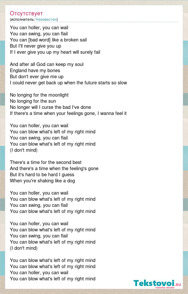 You can holler, you can wail You can swing, you can flail You can [bad word] like a broken sail But I'll never give you up If I ever give you up my heart will surely fail And after all God can keep my soul England have my bones But don't ever give me up I could never get back up when the future starts so slow No longing for the moonlight No longing for the sun No longer will I curse the bad I've done If there's a time when your feelings gone, I wanna feel it You can holler, you can wail You can blow what's left of my right mind You can swing, you can flail You can blow what's left of my right mind (I don't mind) There's a time for the second best And there's a time when the feeling's gone But it's hard to be hard I guess When you're shaking like a dog You can holler, you can wail You can blow what's left of my right mind You can swing, you can flail You can blow what's left of my right mind You can holler, you can wail You can blow what's left of my right mind You can swing, you can flail You can blow what's left of my right mind (I don't mind) You can blow what's left of my right mind You can blow what's left of my right mind You can holler, you can wail You can blow what's left of my right mind