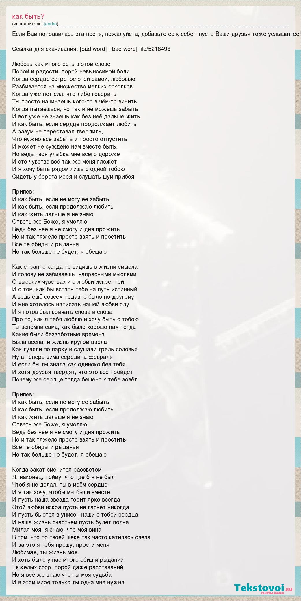 Если Вам понравилась эта песня, пожалуйста, добавьте ее к себе - пусть Ваши друзья тоже услышат ее! Ссылка для скачивания: [bad word] [bad word] file/5218496 Любовь как много есть в этом слове Порой и радости, порой невыносимой боли Когда сердце согретое этой самой, любовью Разбивается на множество мелких осколков Когда уже нет сил, что-либо говорить Ты просто начинаешь кого-то в чём-то винить Когда пытаешься, но так и не можешь забыть И вот уже не знаешь как без неё дальше жить И как быть, если сердце продолжает любить А разум не переставая твердить, Что нужно всё забыть и просто отпустить И может не суждено нам вместе быть. Но ведь твоя улыбка мне всего дороже И это чувство всё так же меня гложет И я хочу быть рядом лишь с одной тобою Сидеть у берега моря и слушать шум прибоя Припев: И как быть, если не могу её забыть И как быть, если продолжаю любить И как жить дальше я не знаю Ответь же Боже, я умоляю Ведь без неё я не смогу и дня прожить Но и так тяжело просто взять и простить Все те обиды и рыданья Но так больше не будет, я обещаю Как странно когда не видишь в жизни смысла И голову не забиваешь напрасными мыслями О высоких чувствах и о любви искренней И о том, как бы встать тебе на путь истинный А ведь ещё совсем недавно было по-другому И мне хотелось написать нашей любви оду И я готов был кричать снова и снова Про то, как я тебя люблю и хочу быть с тобою Ты вспомни сама, как было хорошо нам тогда Какие были беззаботные времена Была весна, и жизнь кругом цвела Как гуляли по парку и слушали трель соловья Ну а теперь зима середина февраля И если бы ты знала как одиноко без тебя И хотя друзья твердят, что это всё пройдёт Почему же сердце тогда бешено к тебе зовёт Припев: И как быть, если не могу её забыть И как быть, если продолжаю любить И как жить дальше я не знаю Ответь же Боже, я умоляю Ведь без неё я не смогу и дня прожить Но и так тяжело просто взять и простить Все те обиды и рыданья Но так больше не будет, я обещаю Когда закат сменится рассветом Я, наконец, пойму, что где б я не был Чтоб я не делал, ты в моём сердце И я так хочу, чтобы мы были вместе И пусть наша звезда горит ярко всегда Этой любви искра пусть не гаснет никогда И пусть бьются в унисон наши с тобой сердца И наша жизнь счастьем пусть будет полна Милая моя, я знаю, что моя вина В том, что по твоей щеке так часто катилась слеза И за это я тебя прошу, прости меня Любимая, ты жизнь моя И хоть было у нас много обид и рыданий Тяжелых ссор, порой даже расставаний Но я всё же знаю что ты моя судьба И в этом мире только ты одна мне нужна