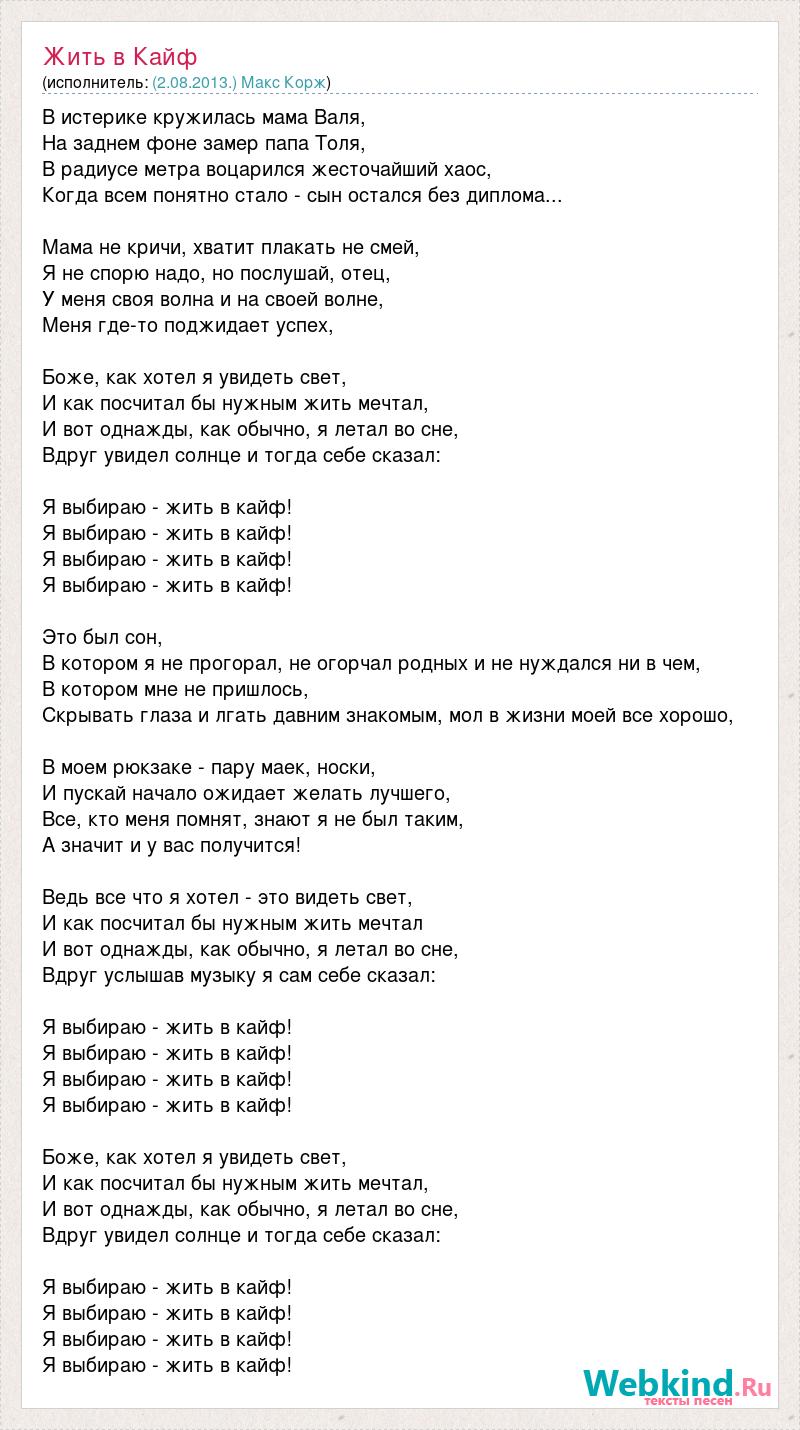 В истерике кружилась мама Валя, На заднем фоне замер папа Толя, В радиусе метра воцарился жесточайший хаос, Когда всем понятно стало - сын остался без диплома... Мама не кричи, хватит плакать не смей, Я не спорю надо, но послушай, отец, У меня своя волна и на своей волне, Меня где-то поджидает успех, Боже, как хотел я увидеть свет, И как посчитал бы нужным жить мечтал, И вот однажды, как обычно, я летал во сне, Вдруг увидел солнце и тогда себе сказал: Я выбираю - жить в кайф! Я выбираю - жить в кайф! Я выбираю - жить в кайф! Я выбираю - жить в кайф! Это был сон, В котором я не прогорал, не огорчал родных и не нуждался ни в чем, В котором мне не пришлось, Скрывать глаза и лгать давним знакомым, мол в жизни моей все хорошо, В моем рюкзаке - пару маек, носки, И пускай начало ожидает желать лучшего, Все, кто меня помнят, знают я не был таким, А значит и у вас получится! Ведь все что я хотел - это видеть свет, И как посчитал бы нужным жить мечтал И вот однажды, как обычно, я летал во сне, Вдруг услышав музыку я сам себе сказал: Я выбираю - жить в кайф! Я выбираю - жить в кайф! Я выбираю - жить в кайф! Я выбираю - жить в кайф! Боже, как хотел я увидеть свет, И как посчитал бы нужным жить мечтал, И вот однажды, как обычно, я летал во сне, Вдруг увидел солнце и тогда себе сказал: Я выбираю - жить в кайф! Я выбираю - жить в кайф! Я выбираю - жить в кайф! Я выбираю - жить в кайф!