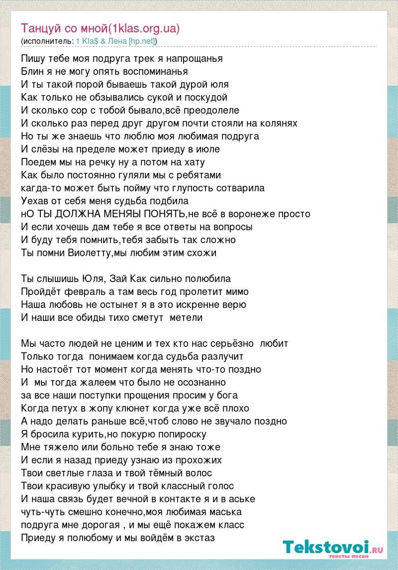 Пишу тебе моя подруга трек я напрощанья Блин я не могу опять воспоминанья И ты такой порой бываешь такой дурой юля Как только не обзывались сукой и поскудой И сколько сор с тобой бывало,всё преодолеле И сколько раз перед друг другом почти стояли на колянях Но ты же знаешь что люблю моя любимая подруга И слёзы на пределе может приеду в июле Поедем мы на речку ну а потом на хату Как было постоянно гуляли мы с ребятами кагда-то может быть пойму что глупость сотварила Уехав от себя меня судьба подбила нО ТЫ ДОЛЖНА МЕНЯЫ ПОНЯТЬ,не всё в воронеже просто И если хочешь дам тебе я все ответы на вопросы И буду тебя помнить,тебя забыть так сложно Ты помни Виолетту,мы любим этим схожи Ты слышишь Юля, Зай Как сильно полюбила Пройдёт февраль а там весь год пролетит мимо Наша любовь не остынет я в это искренне верю И наши все обиды тихо сметут метели Мы часто людей не ценим и тех кто нас серьёзно любит Только тогда понимаем когда судьба разлучит Но настоёт тот момент когда менять что-то поздно И мы тогда жалеем что было не осознанно за все наши поступки прощения просим у бога Когда петух в жопу клюнет когда уже всё плохо А надо делать раньше всё,чтоб слово не звучало поздно Я бросила курить,но покурю попироску Мне тяжело или больно тебе я знаю тоже И если я назад приеду узнаю из прохожих Твои светлые глаза и твой тёмный волос Твои красивую улыбку и твой классный голос И наша связь будет вечной в контакте я и в аське чуть-чуть смешно конечно,моя любимая маська подруга мне дорогая , и мы ещё покажем класс Приеду я полюбому и мы войдём в экстаз