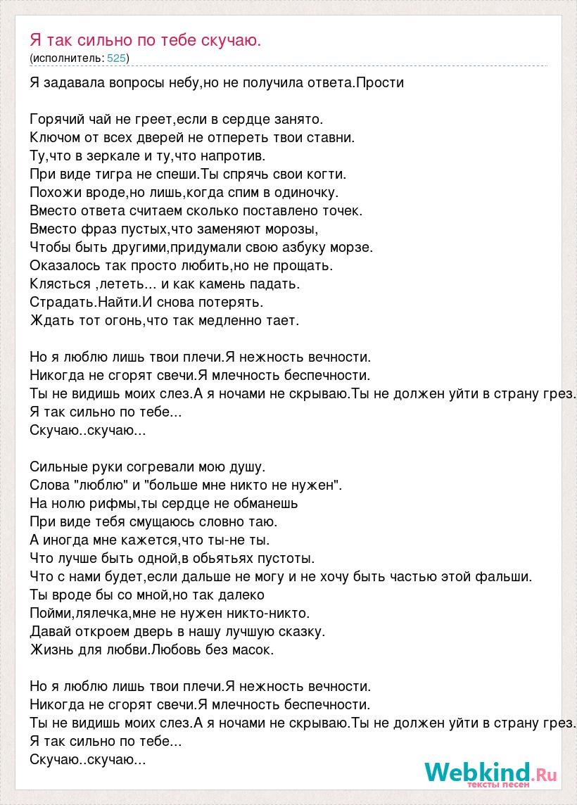 Я задавала вопросы небу,но не получила ответа.Прости Горячий чай не греет,если в сердце занято. Ключом от всех дверей не отпереть твои ставни. Ту,что в зеркале и ту,что напротив. При виде тигра не спеши.Ты спрячь свои когти. Похожи вроде,но лишь,когда спим в одиночку. Вместо ответа считаем сколько поставлено точек. Вместо фраз пустых,что заменяют морозы, Чтобы быть другими,придумали свою азбуку морзе. Оказалось так просто любить,но не прощать. Клясться ,лететь... и как камень падать. Страдать.Найти.И снова потерять. Ждать тот огонь,что так медленно тает. Но я люблю лишь твои плечи.Я нежность вечности. Никогда не сгорят свечи.Я млечность беспечности. Ты не видишь моих слез.А я ночами не скрываю.Ты не должен уйти в страну грез. Я так сильно по тебе... Скучаю..скучаю... Сильные руки согревали мою душу. Слова "люблю" и "больше мне никто не нужен". На нолю рифмы,ты сердце не обманешь При виде тебя смущаюсь словно таю. А иногда мне кажется,что ты-не ты. Что лучше быть одной,в обьятьях пустоты. Что с нами будет,если дальше не могу и не хочу быть частью этой фальши. Ты вроде бы со мной,но так далеко Пойми,лялечка,мне не нужен никто-никто. Давай откроем дверь в нашу лучшую сказку. Жизнь для любви.Любовь без масок. Но я люблю лишь твои плечи.Я нежность вечности. Никогда не сгорят свечи.Я млечность беспечности. Ты не видишь моих слез.А я ночами не скрываю.Ты не должен уйти в страну грез. Я так сильно по тебе... Скучаю..скучаю...