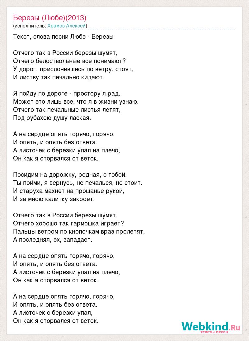 Текст, слова песни Любэ - Березы Отчего так в России березы шумят, Отчего белоствольные все понимают? У дорог, прислонившись по ветру, стоят, И листву так печально кидают. Я пойду по дороге - простору я рад. Может это лишь все, что я в жизни узнаю. Отчего так печальные листья летят, Под рубахою душу лаская. А на сердце опять горячо, горячо, И опять, и опять без ответа. А листочек с березки упал на плечо, Он как я оторвался от веток. Посидим на дорожку, родная, с тобой. Ты пойми, я вернусь, не печалься, не стоит. И старуха махнет на прощанье рукой, И за мною калитку закроет. Отчего так в России березы шумят, Отчего хорошо так гармошка играет? Пальцы ветром по кнопочкам враз пролетят, А последняя, эх, западает. А на сердце опять горячо, горячо, И опять, и опять без ответа. А листочек с березки упал на плечо, Он как я оторвался от веток. А на сердце опять горячо, горячо, И опять, и опять без ответа. А листочек с березки упал, Он как я оторвался от веток.