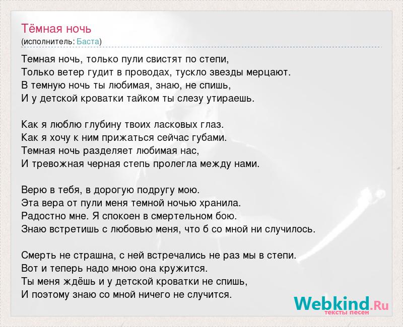 Темная ночь, только пули свистят по степи, Только ветер гудит в проводах, тускло звезды мерцают. В темную ночь ты любимая, знаю, не спишь, И у детской кроватки тайком ты слезу утираешь. Как я люблю глубину твоих ласковых глаз. Как я хочу к ним прижаться сейчас губами. Темная ночь разделяет любимая нас, И тревожная черная степь пролегла между нами. Верю в тебя, в дорогую подругу мою. Эта вера от пули меня темной ночью хранила. Радостно мне. Я спокоен в смертельном бою. Знаю встретишь с любовью меня, что б со мной ни случилось. Смерть не страшна, с ней встречались не раз мы в степи. Вот и теперь надо мною она кружится. Ты меня ждёшь и у детской кроватки не спишь, И поэтому знаю со мной ничего не случится.