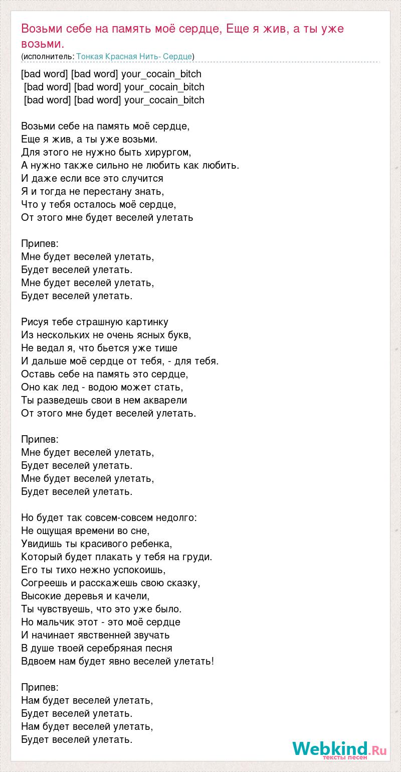 [bad word] [bad word] your_cocain_bitch [bad word] [bad word] your_cocain_bitch [bad word] [bad word] your_cocain_bitch Возьми себе на память моё сердце, Еще я жив, а ты уже возьми. Для этого не нужно быть хирургом, А нужно также сильно не любить как любить. И даже если все это случится Я и тогда не перестану знать, Что у тебя осталось моё сердце, От этого мне будет веселей улетать Припев: Мне будет веселей улетать, Будет веселей улетать. Мне будет веселей улетать, Будет веселей улетать. Рисуя тебе страшную картинку Из нескольких не очень ясных букв, Не ведал я, что бьется уже тише И дальше моё сердце от тебя, - для тебя. Оставь себе на память это сердце, Оно как лед - водою может стать, Ты разведешь свои в нем акварели От этого мне будет веселей улетать. Припев: Мне будет веселей улетать, Будет веселей улетать. Мне будет веселей улетать, Будет веселей улетать. Но будет так совсем-совсем недолго: Не ощущая времени во сне, Увидишь ты красивого ребенка, Который будет плакать у тебя на груди. Его ты тихо нежно успокоишь, Согреешь и расскажешь свою сказку, Высокие деревья и качели, Ты чувствуешь, что это уже было. Но мальчик этот - это моё сердце И начинает явственней звучать В душе твоей серебряная песня Вдвоем нам будет явно веселей улетать! Припев: Нам будет веселей улетать, Будет веселей улетать. Нам будет веселей улетать, Будет веселей улетать.