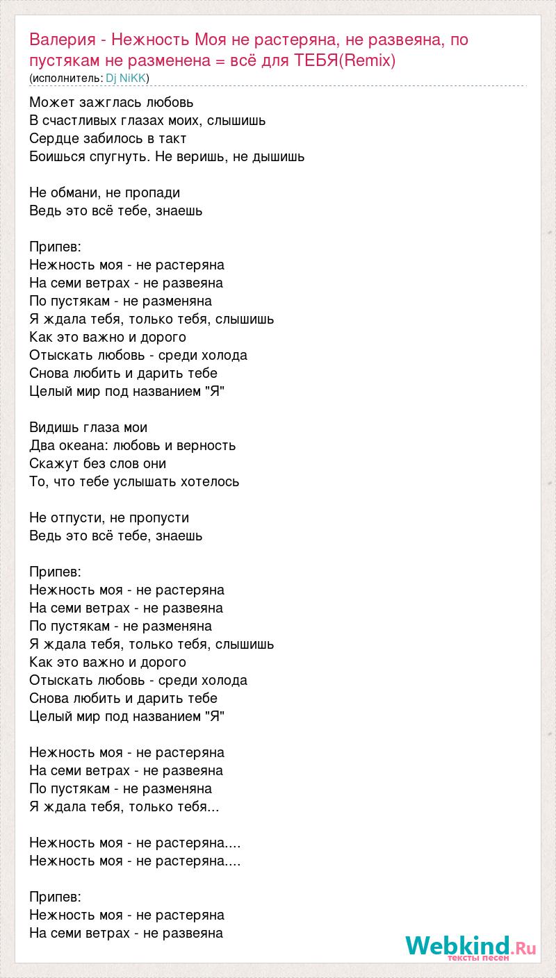 Может зажглась любовь В счастливых глазах моих, слышишь Сердце забилось в такт Боишься спугнуть. Не веришь, не дышишь Не обмани, не пропади Ведь это всё тебе, знаешь Припев: Нежность моя - не растеряна На семи ветрах - не развеяна По пустякам - не разменяна Я ждала тебя, только тебя, слышишь Как это важно и дорого Отыскать любовь - среди холода Снова любить и дарить тебе Целый мир под названием "Я" Видишь глаза мои Два океана: любовь и верность Скажут без слов они То, что тебе услышать хотелось Не отпусти, не пропусти Ведь это всё тебе, знаешь Припев: Нежность моя - не растеряна На семи ветрах - не развеяна По пустякам - не разменяна Я ждала тебя, только тебя, слышишь Как это важно и дорого Отыскать любовь - среди холода Снова любить и дарить тебе Целый мир под названием "Я" Нежность моя - не растеряна На семи ветрах - не развеяна По пустякам - не разменяна Я ждала тебя, только тебя... Нежность моя - не растеряна.... Нежность моя - не растеряна.... Припев: Нежность моя - не растеряна На семи ветрах - не развеяна