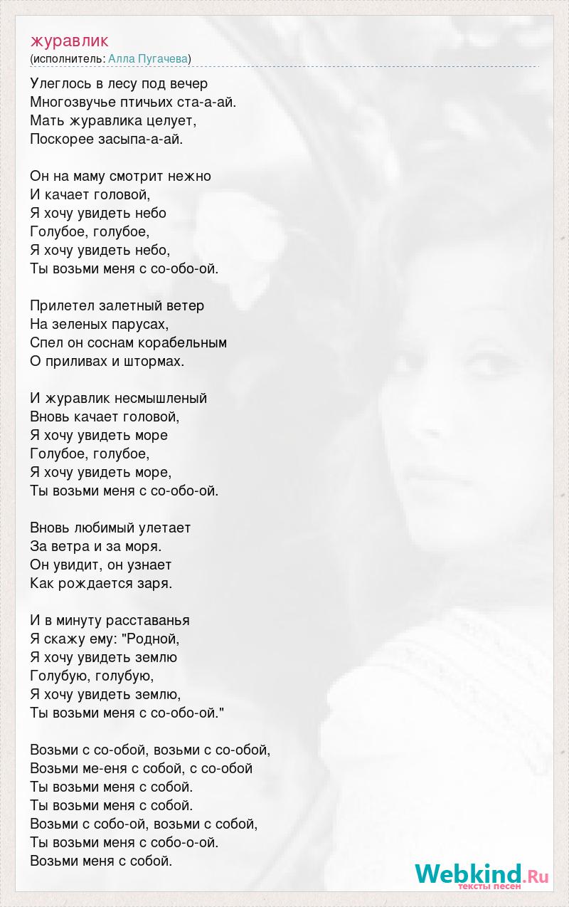 Улеглось в лесу под вечер Многозвучье птичьих ста-а-ай. Мать журавлика целует, Поскорее засыпа-а-ай. Он на маму смотрит нежно И качает головой, Я хочу увидеть небо Голубое, голубое, Я хочу увидеть небо, Ты возьми меня с со-обо-ой. Прилетел залетный ветер На зеленых парусах, Спел он соснам корабельным О приливах и штормах. И журавлик несмышленый Вновь качает головой, Я хочу увидеть море Голубое, голубое, Я хочу увидеть море, Ты возьми меня с со-обо-ой. Вновь любимый улетает За ветра и за моря. Он увидит, он узнает Как рождается заря. И в минуту расставанья Я скажу ему: "Родной, Я хочу увидеть землю Голубую, голубую, Я хочу увидеть землю, Ты возьми меня с со-обо-ой." Возьми с со-обой, возьми с со-обой, Возьми ме-еня с собой, с со-обой Ты возьми меня с собой. Ты возьми меня с собой. Возьми с собо-ой, возьми с собой, Ты возьми меня с собо-о-ой. Возьми меня с собой.