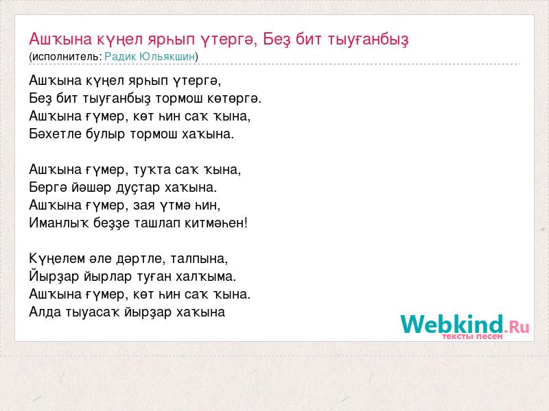 Ашҡына күңел ярһып үтергә, Беҙ бит тыуғанбыҙ тормош көтөргә. Ашҡына ғүмер, көт һин саҡ ҡына, Бәхетле булыр тормош хаҡына. Ашҡына ғүмер, туҡта саҡ ҡына, Бергә йәшәр дуҫтар хаҡына. Ашҡына ғүмер, зая үтмә һин, Иманлыҡ беҙҙе ташлап китмәһен! Күңелем әле дәртле, талпына, Йырҙар йырлар туған халҡыма. Ашҡына ғүмер, көт һин саҡ ҡына. Алда тыуасаҡ йырҙар хаҡына