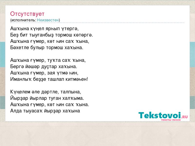 Ашҡына күңел ярһып үтергә, Беҙ бит тыуғанбыҙ тормош көтөргә. Ашҡына ғүмер, көт һин саҡ ҡына, Бәхетле булыр тормош хаҡына. Ашҡына ғүмер, туҡта саҡ ҡына, Бергә йәшәр дуҫтар хаҡына. Ашҡына ғүмер, зая үтмә һин, Иманлыҡ беҙҙе ташлап китмәһен! Күңелем әле дәртле, талпына, Йырҙар йырлар туған халҡыма. Ашҡына ғүмер, көт һин саҡ ҡына. Алда тыуасаҡ йырҙар хаҡына