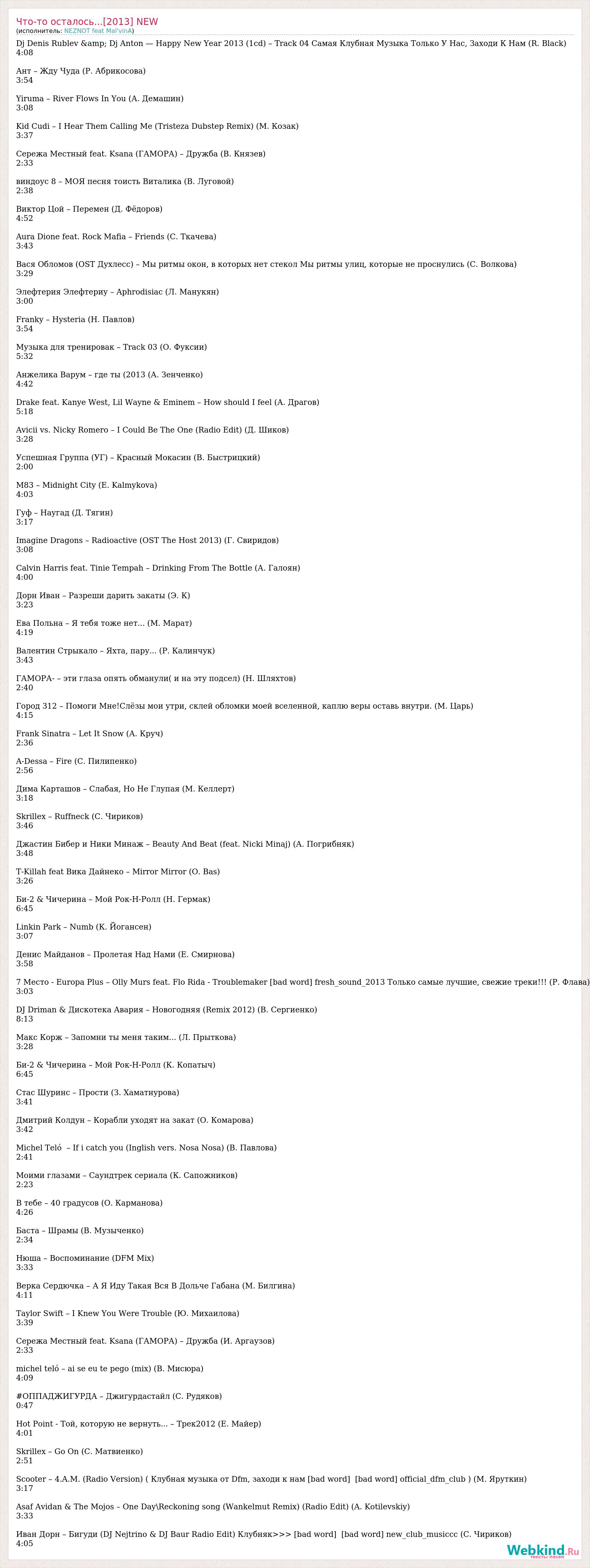 Dj Denis Rublev & Dj Anton — Happy New Year 2013 (1cd) – Track 04 Cамая Клубная Музыка Только У Нас, Заходи К Нам (R. Black) 4:08 Ант – Жду Чуда (Р. Абрикосова) 3:54 Yiruma – River Flows In You (А. Демашин) 3:08 Kid Cudi – I Hear Them Calling Me (Tristeza Dubstep Remix) (М. Козак) 3:37 Сережа Местный feat. Ksana (ГАМОРА) – Дружба (В. Князев) 2:33 виндоус 8 – МОЯ песня тоисть Виталика (В. Луговой) 2:38 Виктор Цой – Перемен (Д. Фёдоров) 4:52 Aura Dione feat. Rock Mafia – Friends (С. Ткачева) 3:43 Вася Обломов (OST Духлесс) – Мы ритмы окон, в которых нет стекол Мы ритмы улиц, которые не проснулись (С. Волкова) 3:29 Элефтерия Элефтериу – Aphrodisiac (Л. Манукян) 3:00 Franky – Hysteria (Н. Павлов) 3:54 Музыка для тренировак – Track 03 (О. Фуксии) 5:32 Анжелика Варум – где ты (2013 (А. Зенченко) 4:42 Drake feat. Kanye West, Lil Wayne & Eminem – How should I feel (А. Драгов) 5:18 Avicii vs. Nicky Romero – I Could Be The One (Radio Edit) (Д. Шиков) 3:28 Успешная Группа (УГ) – Красный Мокасин (В. Быстрицкий) 2:00 M83 – Midnight City (E. Kalmykova) 4:03 Гуф – Наугад (Д. Тягин) 3:17 Imagine Dragons – Radioactive (OST The Host 2013) (Г. Свиридов) 3:08 Calvin Harris feat. Tinie Tempah – Drinking From The Bottle (А. Галоян) 4:00 Дорн Иван – Разреши дарить закаты (Э. К) 3:23 Ева Польна – Я тебя тоже нет... (М. Марат) 4:19 Валентин Стрыкало – Яхта, пару... (Р. Калинчук) 3:43 ГАМОРА- – эти глаза опять обманули( и на эту подсел) (Н. Шляхтов) 2:40 Город 312 – Помоги Мне!Слёзы мои утри, склей обломки моей вселенной, каплю веры оставь внутри. (М. Царь) 4:15 Frank Sinatra – Let It Snow (А. Круч) 2:36 A-Dessa – Fire (С. Пилипенко) 2:56 Дима Карташов – Слабая, Но Не Глупая (М. Келлерт) 3:18 Skrillex – Ruffneck (С. Чириков) 3:46 Джастин Бибер и Ники Минаж – Beauty And Beat (feat. Nicki Minaj) (А. Погрибняк) 3:48 T-Killah feat Вика Дайнеко – Mirror Mirror (O. Bas) 3:26 Би-2 & Чичерина – Мой Рок-Н-Ролл (Н. Гермак) 6:45 Linkin Park – Numb (К. Йогансен) 3:07 Денис Майданов – Пролетая Над Нами (Е. Смирнова) 3:58 7 Место - Europa Plus – Olly Murs feat. Flo Rida - Troublemaker [bad word] fresh_sound_2013 Только самые лучшие, свежие треки!!! (Р. Флава) 3:03 DJ Driman & Дискотека Авария – Новогодняя (Remix 2012) (В. Сергиенко) 8:13 Макс Корж – Запомни ты меня таким... (Л. Прыткова) 3:28 Би-2 & Чичерина – Мой Рок-Н-Ролл (К. Копатыч) 6:45 Стас Шуринс – Прости (З. Хаматнурова) 3:41 Дмитрий Колдун – Корабли уходят на закат (О. Комарова) 3:42 Michel Teló – If i catch you (Inglish vers. Nosa Nosa) (В. Павлова) 2:41 Моими глазами – Саундтрек сериала (К. Сапожников) 2:23 В тебе – 40 градусов (О. Карманова) 4:26 Баста – Шрамы (В. Музыченко) 2:34 Нюша – Воспоминание (DFM Mix) 3:33 Верка Сердючка – А Я Иду Такая Вся В Дольче Габана (М. Билгина) 4:11 Taylor Swift – I Knew You Were Trouble (Ю. Михаилова) 3:39 Сережа Местный feat. Ksana (ГАМОРА) – Дружба (И. Аргаузов) 2:33 michel teló – ai se eu te pego (mix) (В. Мисюра) 4:09 #ОППАДЖИГУРДА – Джигурдастайл (С. Рудяков) 0:47 Hot Point - Той, которую не вернуть... – Трек2012 (Е. Майер) 4:01 Skrillex – Go On (С. Матвиенко) 2:51 Scooter – 4.A.M. (Radio Version) ( Клубная музыка от Dfm, заходи к нам [bad word] [bad word] official_dfm_club ) (М. Яруткин) 3:17 Asaf Avidan & The Mojos – One Day\Reckoning song (Wankelmut Remix) (Radio Edit) (A. Kotilevskiy) 3:33 Иван Дорн – Бигуди (DJ Nejtrino & DJ Baur Radio Edit) Клубняк>>> [bad word] [bad word] new_club_musiccc (С. Чириков) 4:05