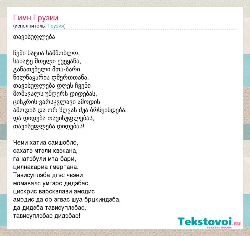 თავისუფლება ჩემი ხატია სამშობლო, სახატე მთელი ქვეყანა, განათებული მთა-ბარი, წილნაყარია ღმერთთანა. თავისუფლება დღეს ჩვენი მომავალს უმღერს დიდებას, ცისკრის ვარსკვლავი ამოდის ამოდის და ორ ზღვას შუა ბრწყინდება, და დიდება თავისუფლებას, თავისუფლება დიდებას! Чеми хатиа самшобло, сахатэ мтэли квэкана, ганатэбули мта-бари, цилнакариа гмертана. Тависуплэба дгэс чвэни момавалс умгэрс дидэбас, цискрис варсквлави амодис амодис да ор згвас шуа брцкиндэба, да дидэба тависуплэбас, тависуплэбас дидэбаc!